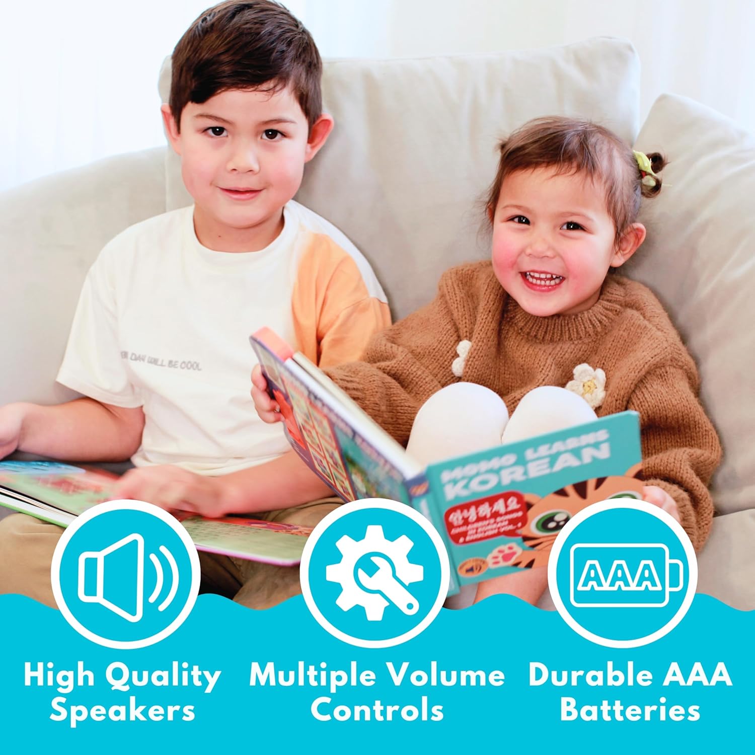 - PORTABLE KOREAN LEARNING TOY FOR TRAVEL. Lightweight and battery-powered, this Korean sound book is perfect for on-the-go learning - whether in the car, at the airport, or during mealtime. Keeps kids entertained and learning without screens or Wi-Fi.