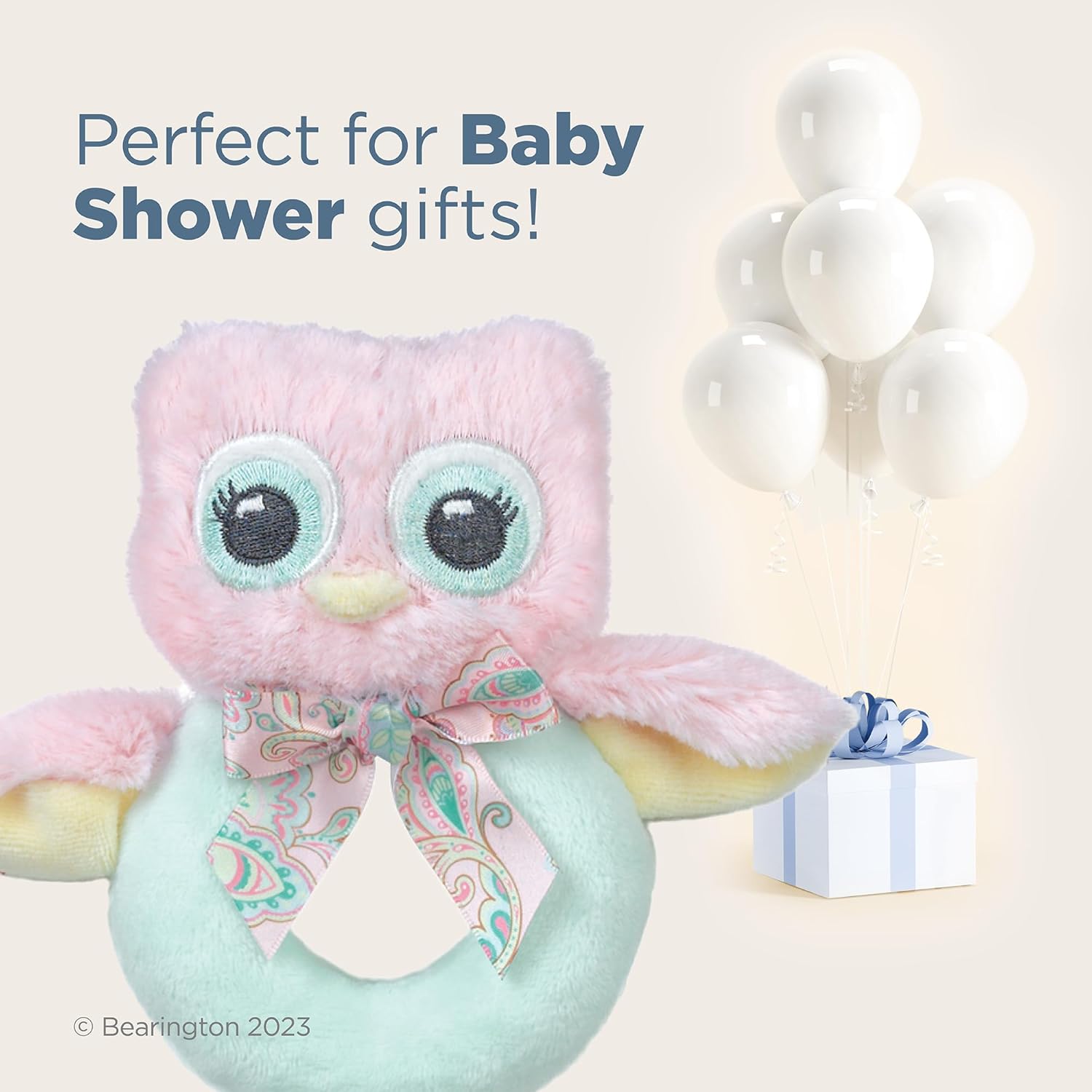 Bearington Baby Lil' Hoots Plush Stuffed Animal Pink Owl Soft Ring Rattle - 5.8" Baby Rattle Newborn Toy