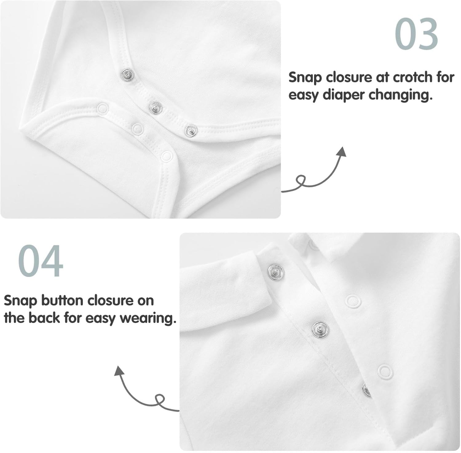 • Snap bottoms for easy diaper changing.