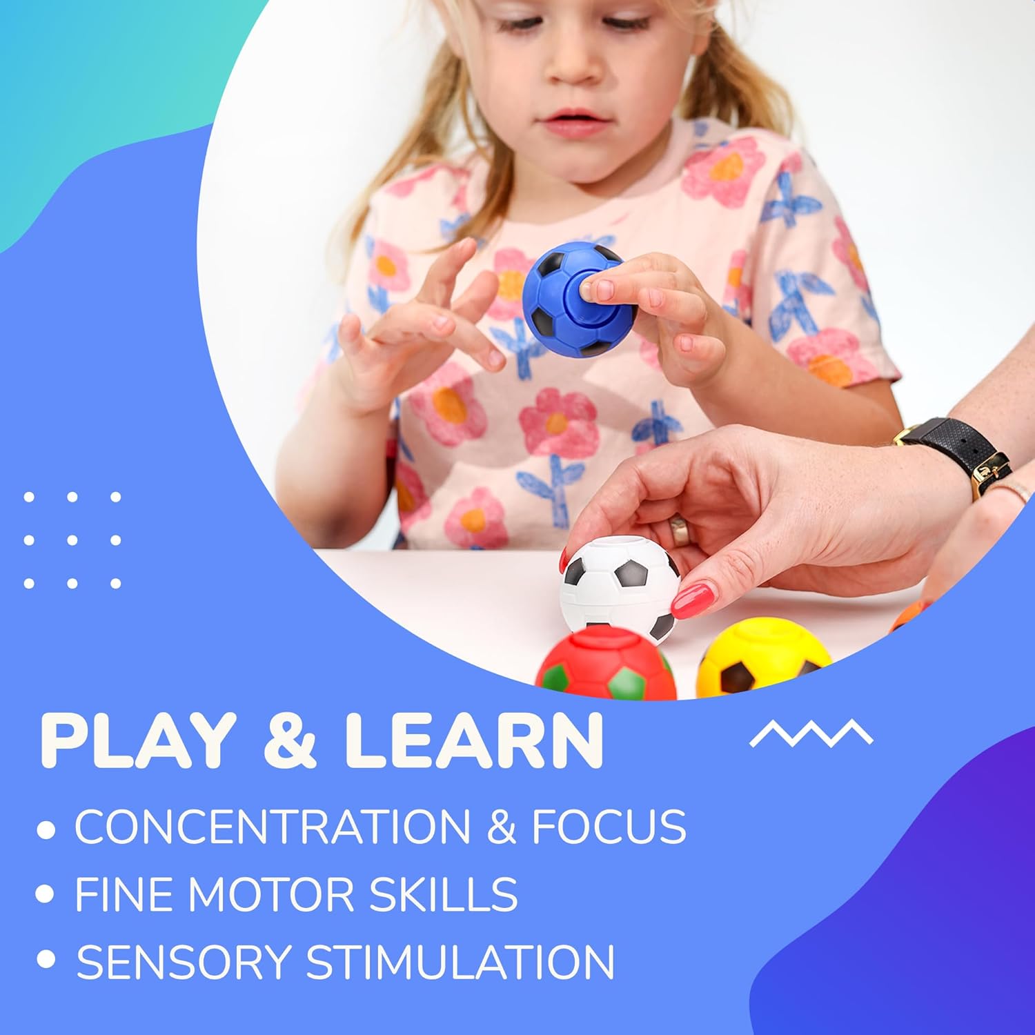 • Soccer ball fidget spinners have a blue color. Stress ball fidget pack resemble a soccer ball
