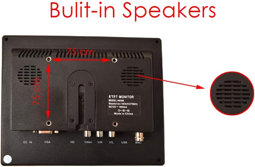 • 【Slim Design】This 8 inch LCD CCTV monitor comes with a very compact design with . With car cigarette lighter charger(DC 12-24V) for portable use. The housing made of ABS material with low temperature ductility and impact resistance. Support Vesa Hanging Holes 75x75mm.