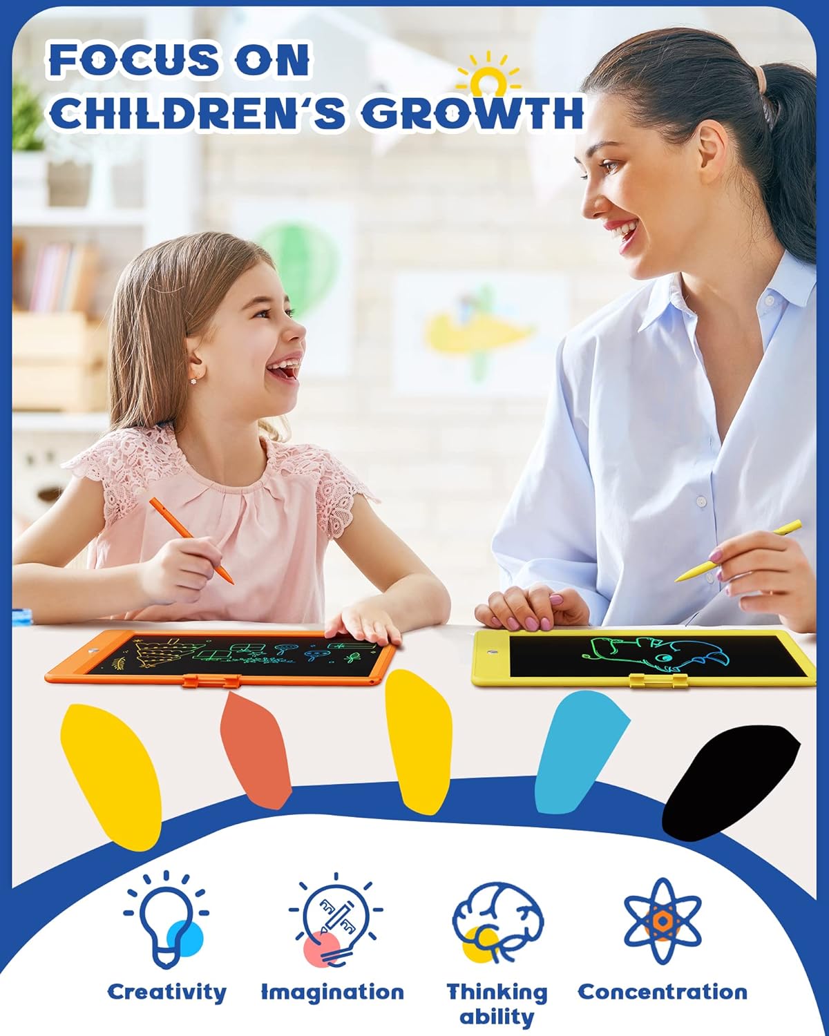 - PORTABLE AND DURABLE: The drawing board for kids is made of durable plastic, plus round corner design, anti-fall and anti-shock, no need to worry kids drop it. The drawing tablets for kids weights only 150 grams, easy to carry, place in school bags, handbags, travel bags. The doodle board also can be used in multiple places: airplane, car, restaurant, sofa, etc.
