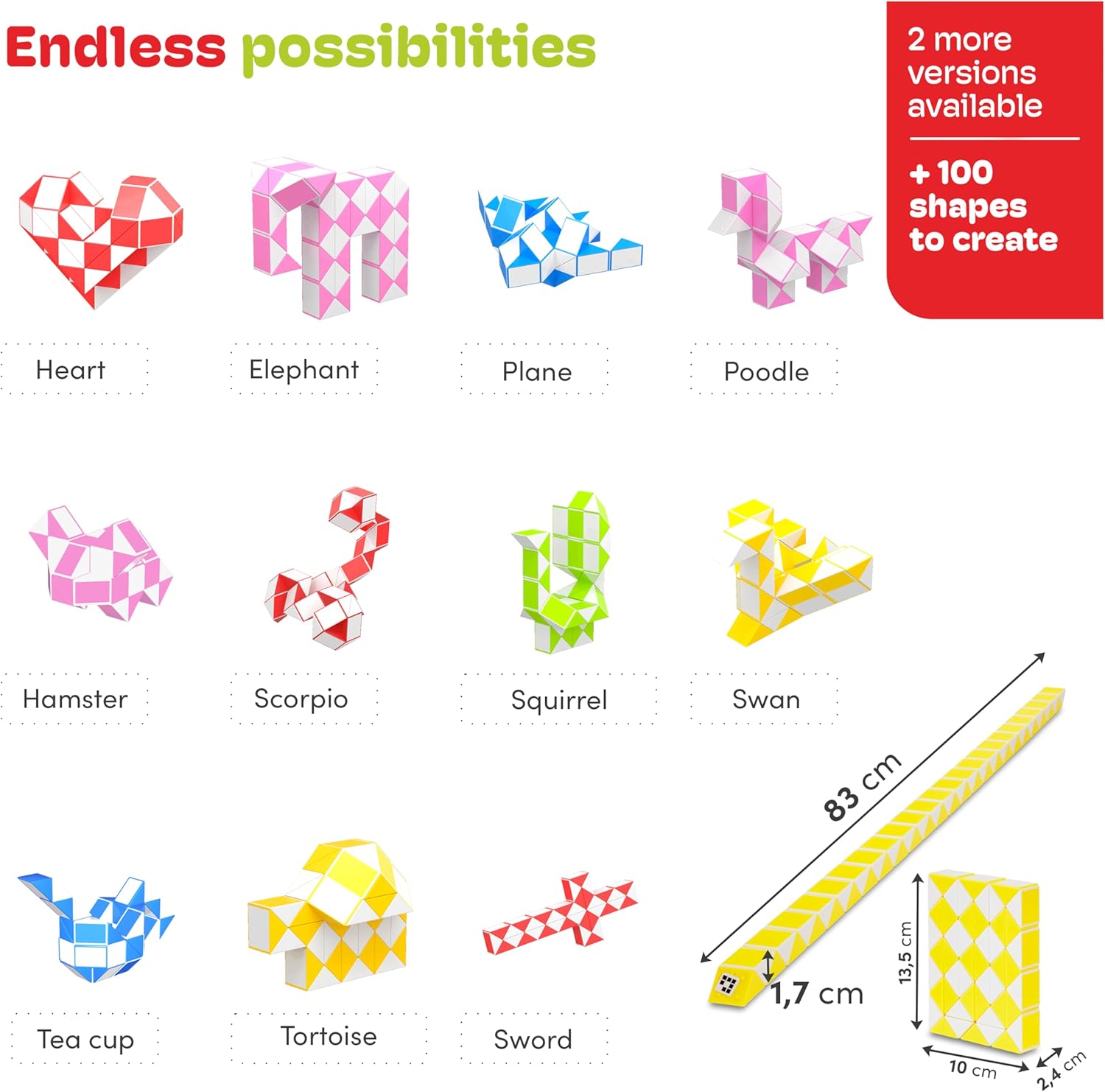 • 1 TOY WITH 100 SHAPES: Create with this snake fidget toy over 100 different figures like a dog, cat or elephant. This fidget snake cube fascinates kids and they love to play with it. Magic snake toy is for kids ages 4-8