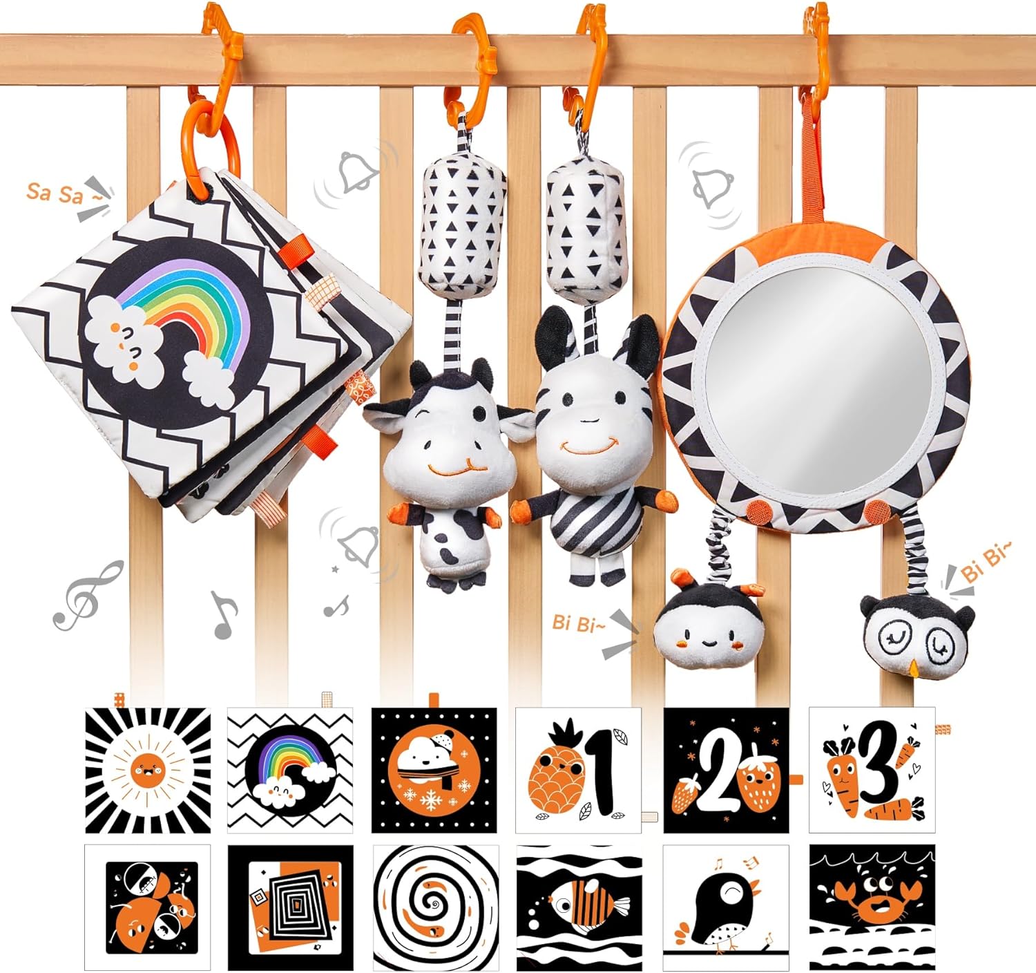 TUMAMA Black and White Baby Toys, High Contrast Tummy Time, Newborn Soft Books Mirror Rattles, Montessori Sensory 0-12 Months, Hanging Infant for Carseat Stroller Play Mat Crib