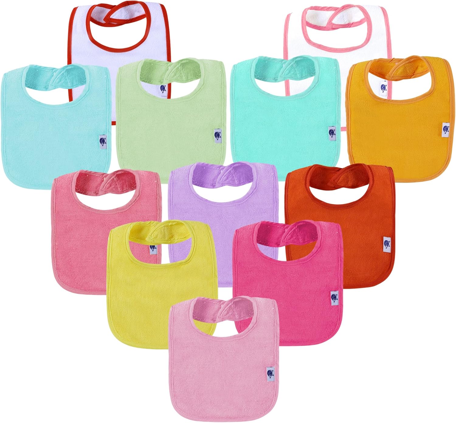 • Double Sided terrycloth design: Snap bib keep your baby clean & dry with these large, waterproof PP lined, terry cloth drooler bibs. The plain bright colors for Girls.