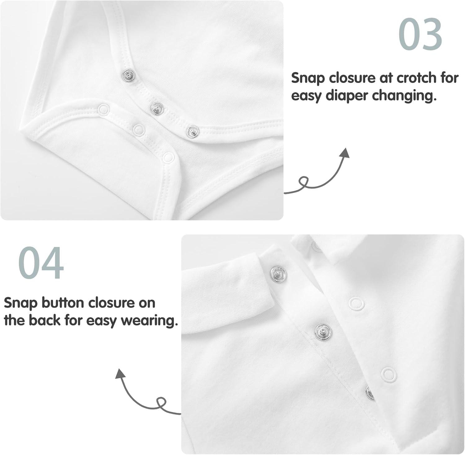 • QUICK WEARING & DIAPER CHANGING - Snap closure ensures easy wearing. 3 snaps at bottom make diaper changing hassle-free