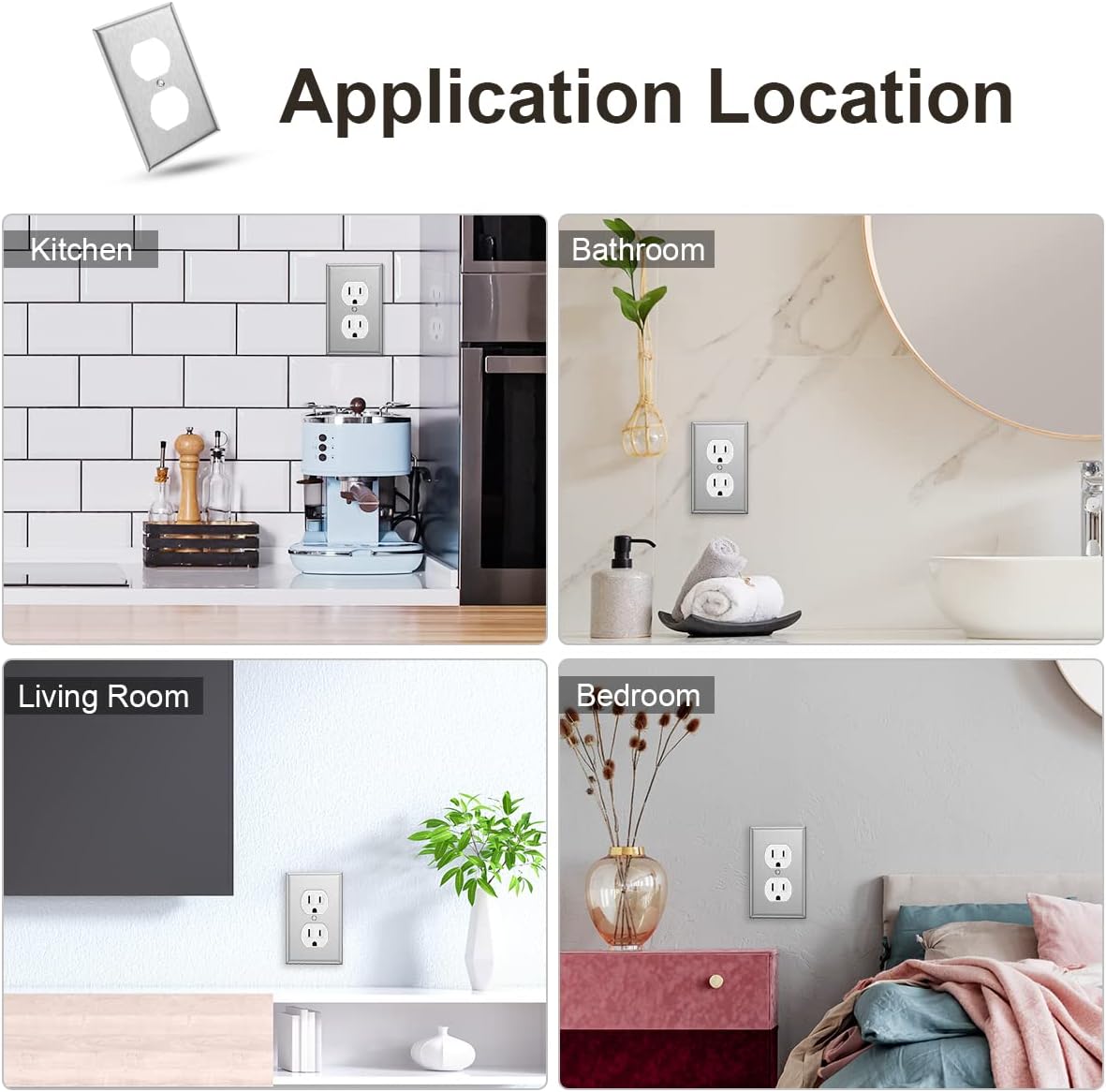 • Metal Wall Plate: Duplex outlet plate is made of stainless steel, the durable metal wall plate can provide high-impact resistance against heavy force. Corrosion resistant material helps extend wall plate life in extreme environments.