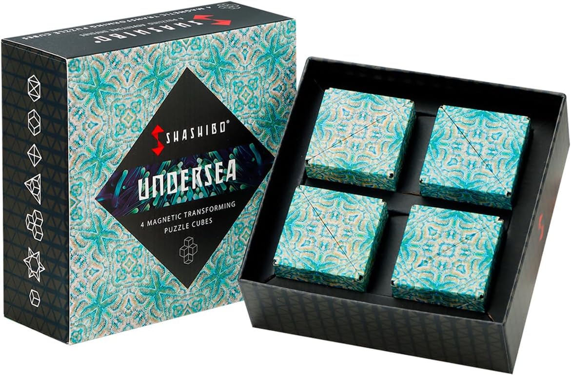 SHASHIBO Shape Shifting Box - Award-Winning, Patented Fidget Cube w/ 36 Rare Earth Magnets - Transforms Into Over 70 Shapes, Gift Box, Download Fun in Motion Toys Mobile App (Undersea, 4 pack)