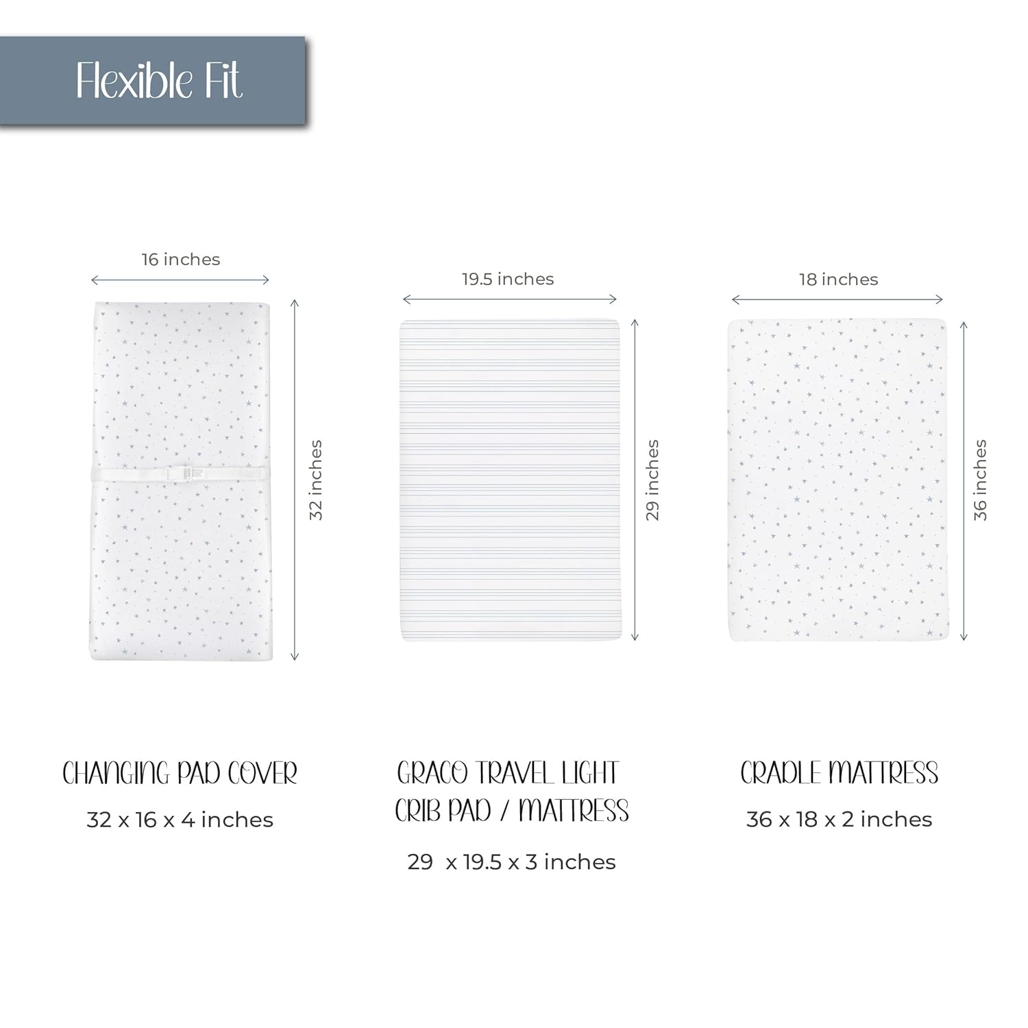 • Flexible Fit: Featuring an adaptable elastic band, these sheets offer a super stretchy, flexible fit while supplying a safe and secure, snug fit to multiple sizes of changing pads, cradle mattress.