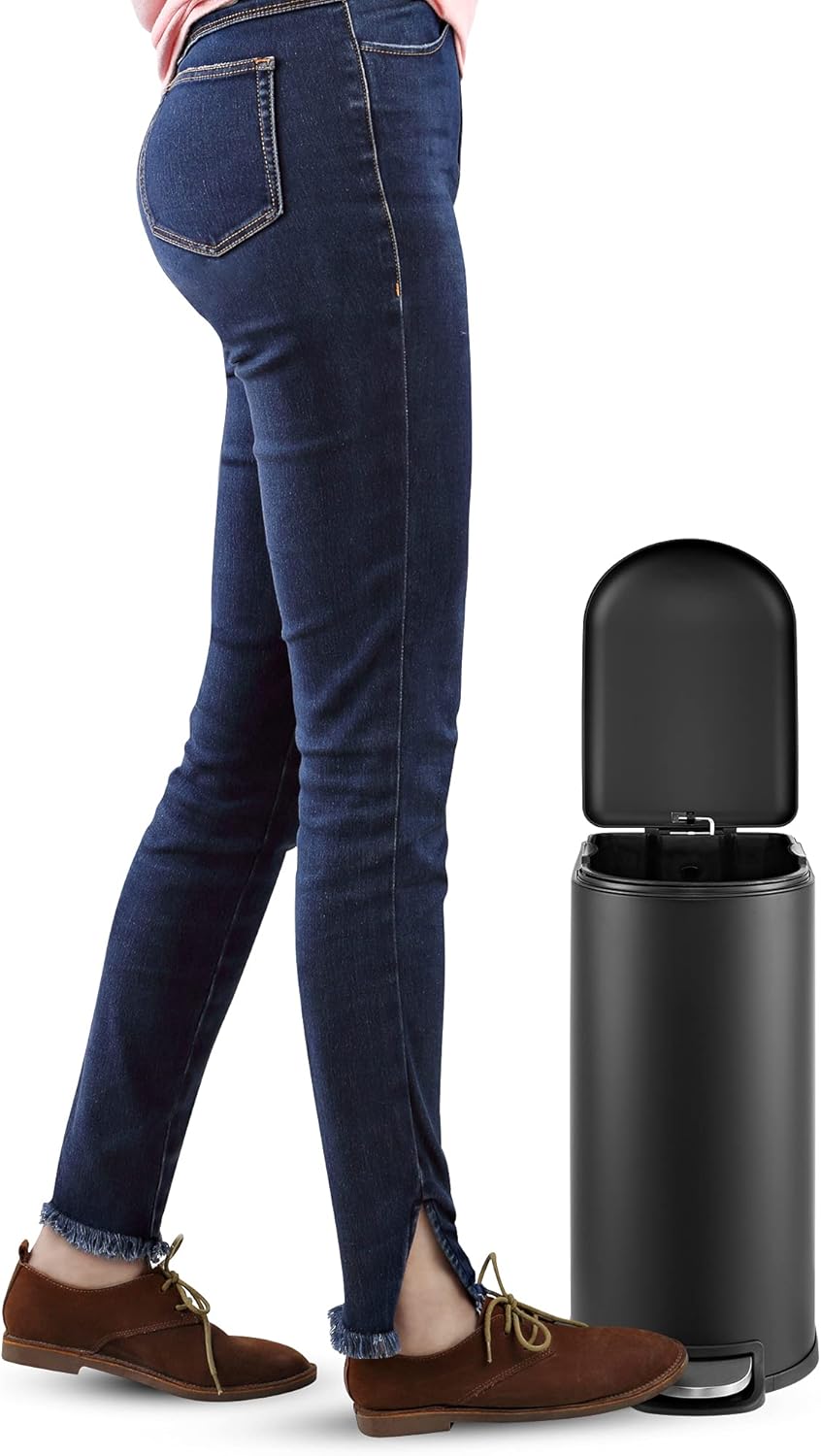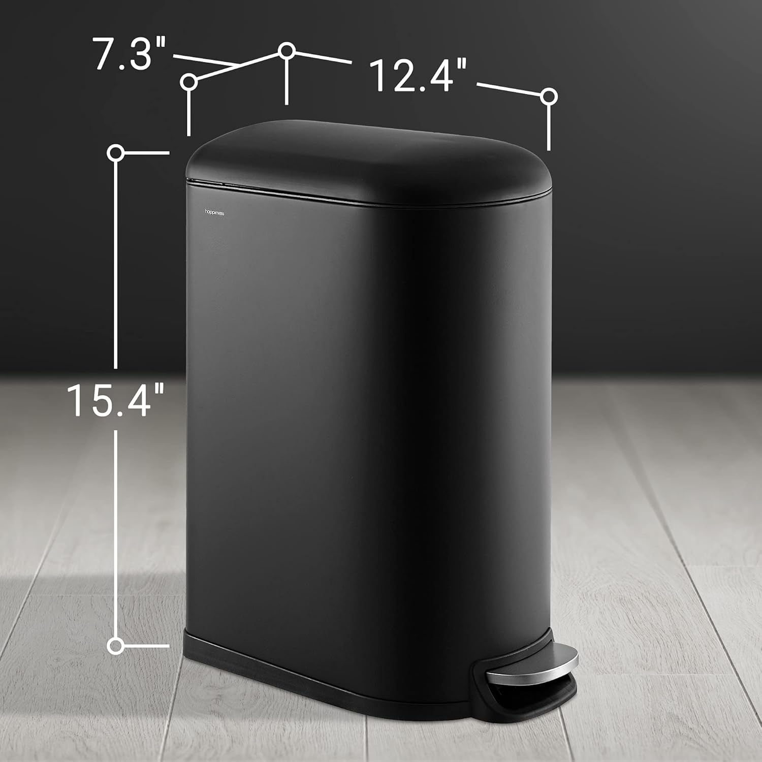 • STYLISH & PRACTICAL DESIGN: happimess Trash Cans clean-lined designs blend beautifully into your existing decor; Dispose of trash hands-free with our convenient step pedal; built-in damper lowers the lid quietly, and closes it tightly to keep odors inside