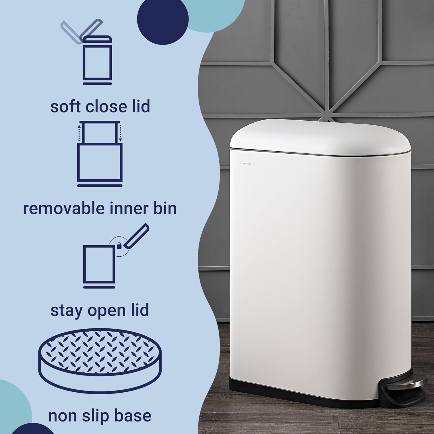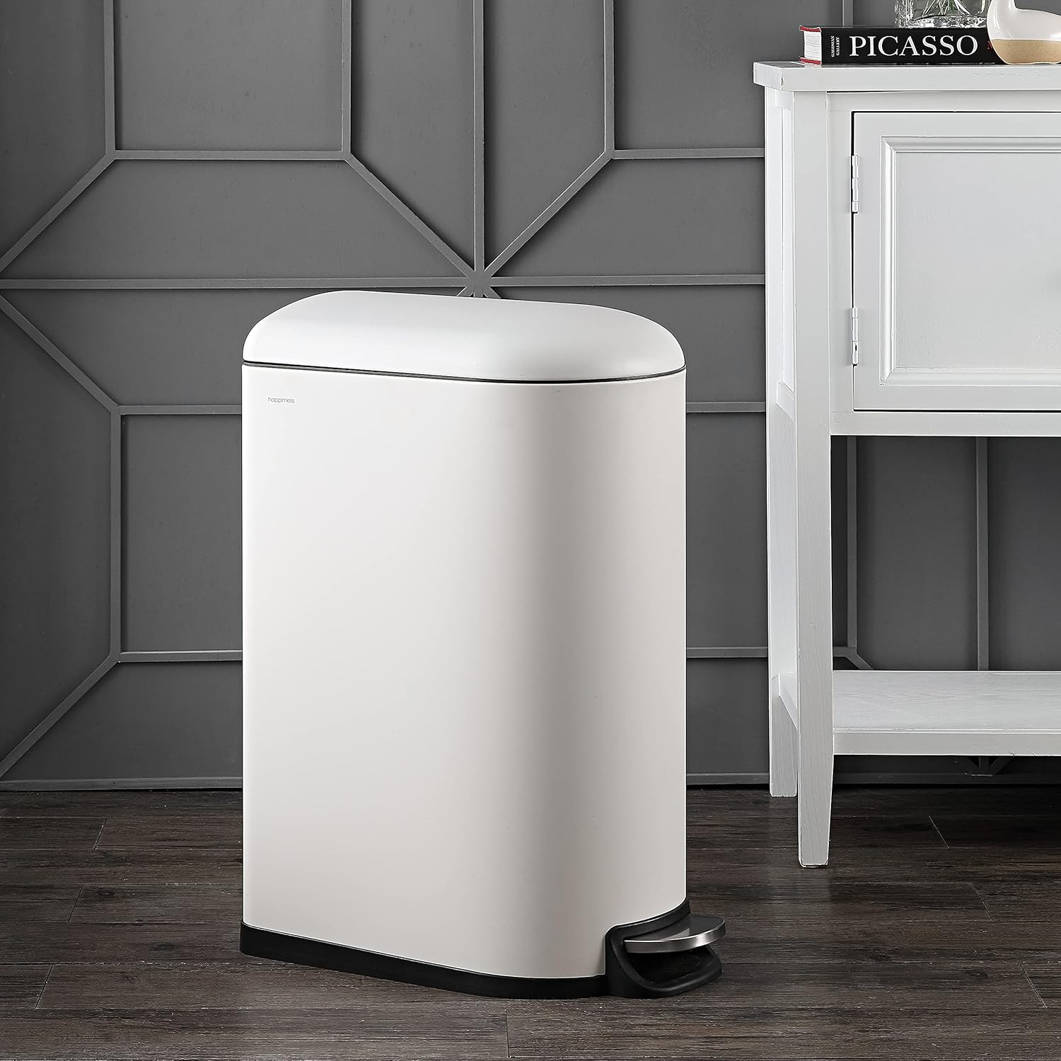 • STYLISH & PRACTICAL DESIGN: happimess Trash Cans clean-lined designs blend beautifully into your existing decor; Dispose of trash hands-free with our convenient step pedal; built-in damper lowers the lid quietly, and closes it tightly to keep odors inside