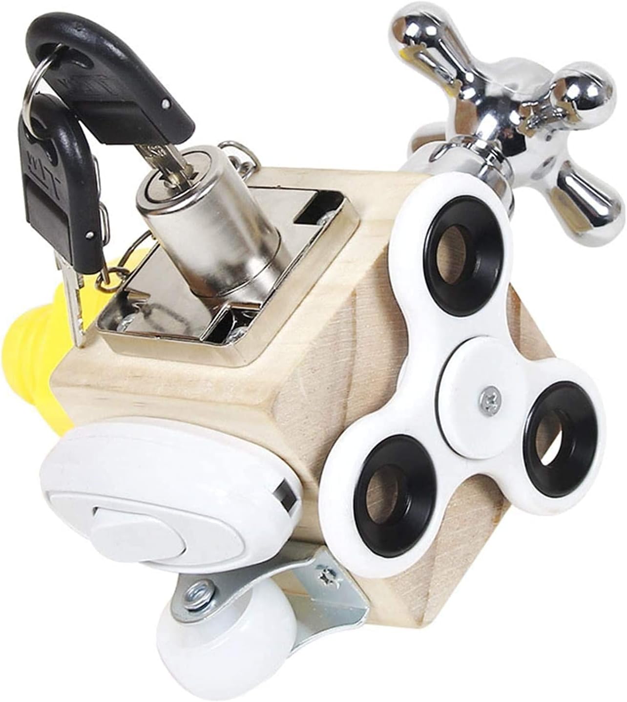 • 7 different activities: 1. A scale tap that can be rotated. 2. Key lock with 2 attached keys. 3. A very popular toy for stress relief 4. The light switch clicks audible when pressed. 5. A free rotating wheel. 6. Spring latch: press the pin until it clicks into place and releases with a button. 7. Nut can be screwed on and off to the screw.