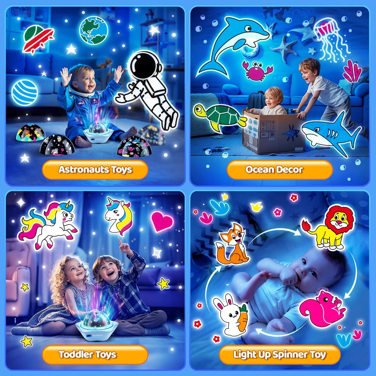 - UNIQUE 2 in1 Star Projector for Kids Dinosaur Toys: Unique & Pretty star projector for kids toys & dinosaur toys for kids 2-9 looks fun & cool,this favourite kids night light projector boasts of 6 most colorful films especially designed for kids! !The star projector for kids toys has 6 colorful films make 90 lighting show,can projection the star moon,ocean,unicorn,dinosaur,lion,Astronauts ceiling & wall,creating a dream-like create a funny pleasant and relaxing play&sleep environment for kids.Which kids can deny a cute dinosaurs /stars/Astronauts projected on kids bedroom&accompany kids into sleep?Just take this dinosaur toys & star projector as kids most unforgettable kids toys&kids gifts!