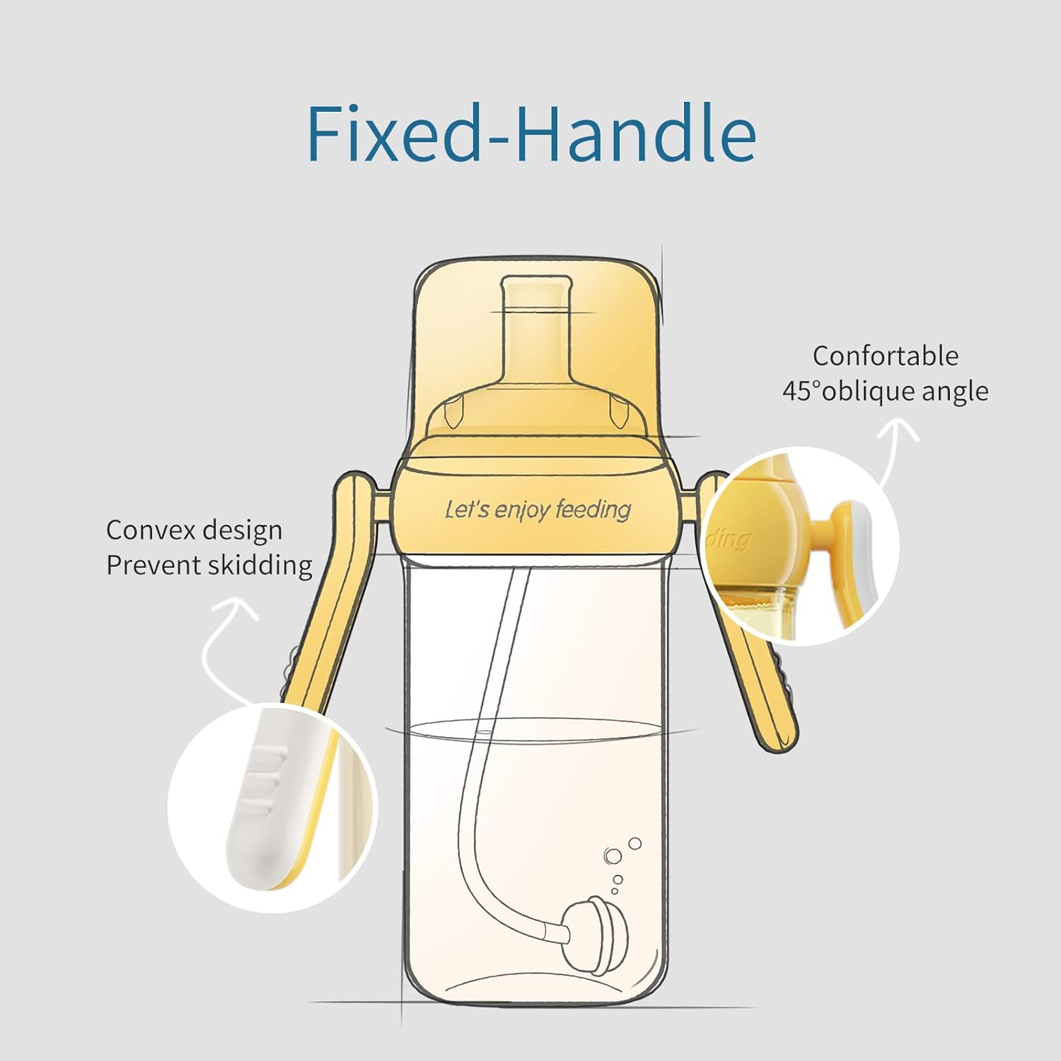 • Comfortable Handle: The angle between the handle and the cup is 45 degrees, making it easier for babies to grasp. The convex design on the surface increases the friction of the baby's hand and is not easy to fall.