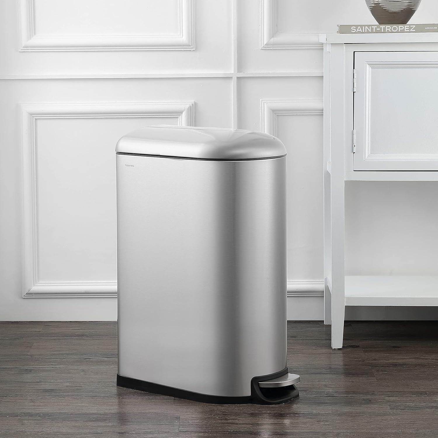 • STYLISH & PRACTICAL DESIGN: happimess Trash Cans clean-lined designs blend beautifully into your existing decor; Dispose of trash hands-free with our convenient step pedal; built-in damper lowers the lid quietly, and closes it tightly to keep odors inside