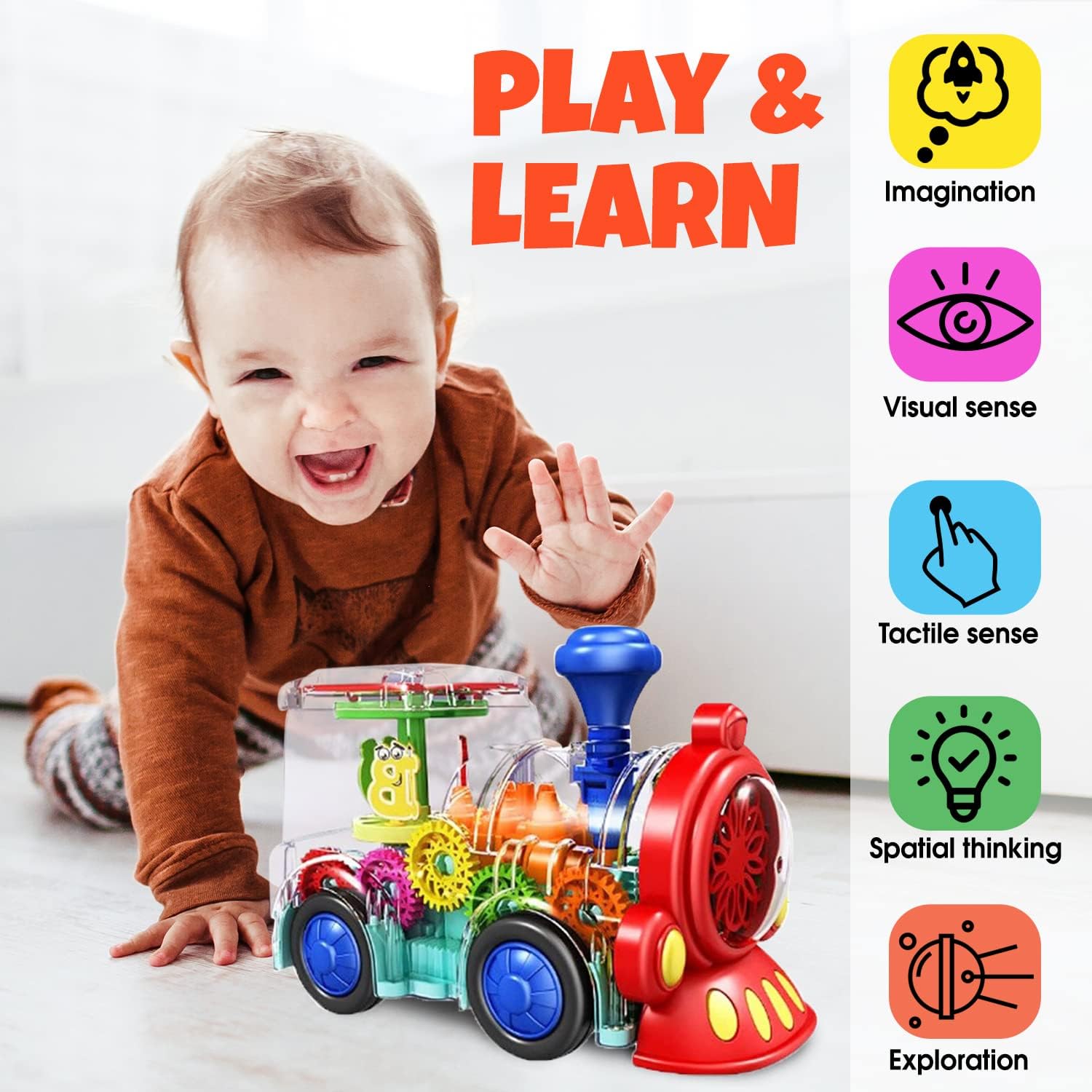 Transparent Sensory Train Toy - Fun and Interactive Toy for Kids - Music Train with LED Light up - Colorful Moving Gears -Tummy Time Crawling Baby Toys - Birthday Gift Idea for Boys & Girls