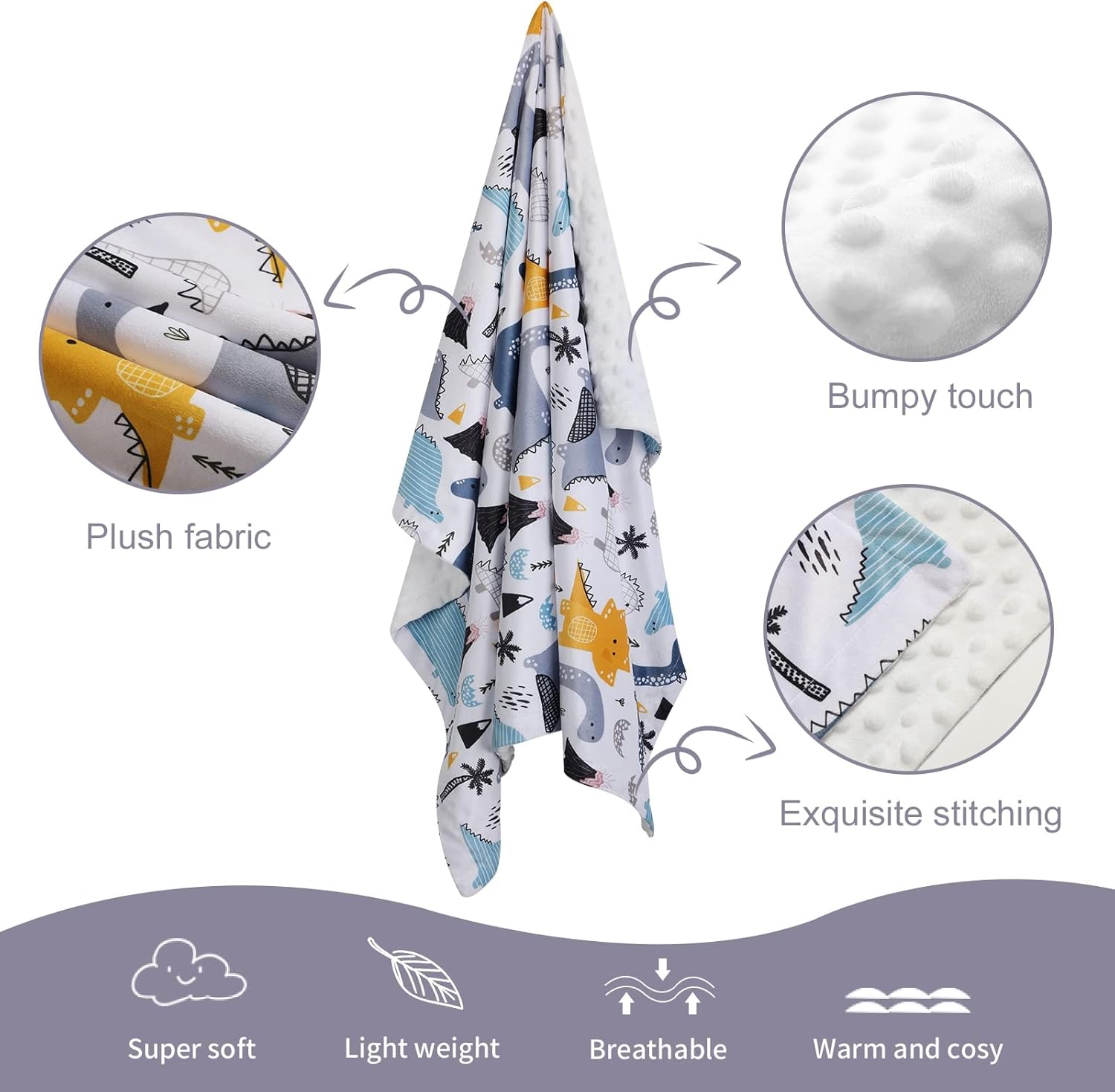 • 1.【Warm & Cosy】We use super soft minky fleece. Double-sided reversible design offer you different soft with one side of smooth and 3D dotted to the other. Light and breathable, warm and cosy,like mother's touch,will help calm little ones. Treat children to restful naps and cozy nights. suitable for baby boy or baby girl.