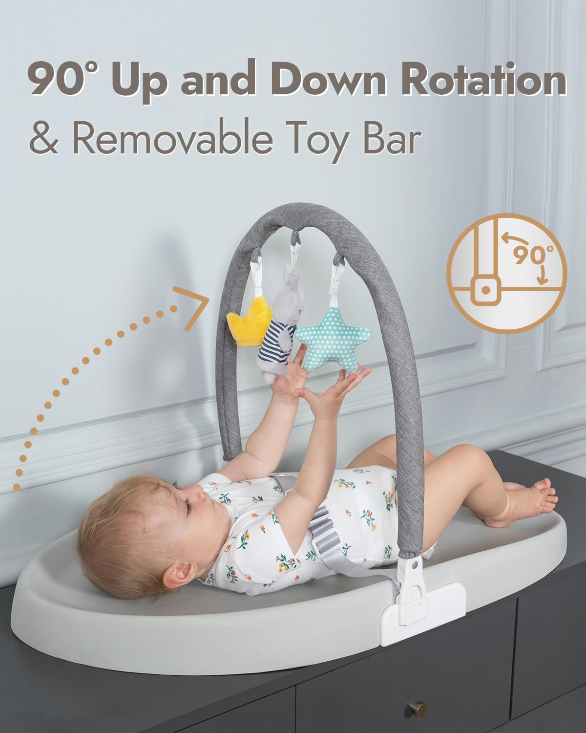 • 90° Up and Down Rotation & Removable Toy Bar: Includes a crown with a baby-safe mirror, a star with hidden crinkle paper, and a rabbit doll keeps the baby entertained. The toy bar attracts your baby to look, play and grasp while you change the diaper, and easy to store while not in use.
