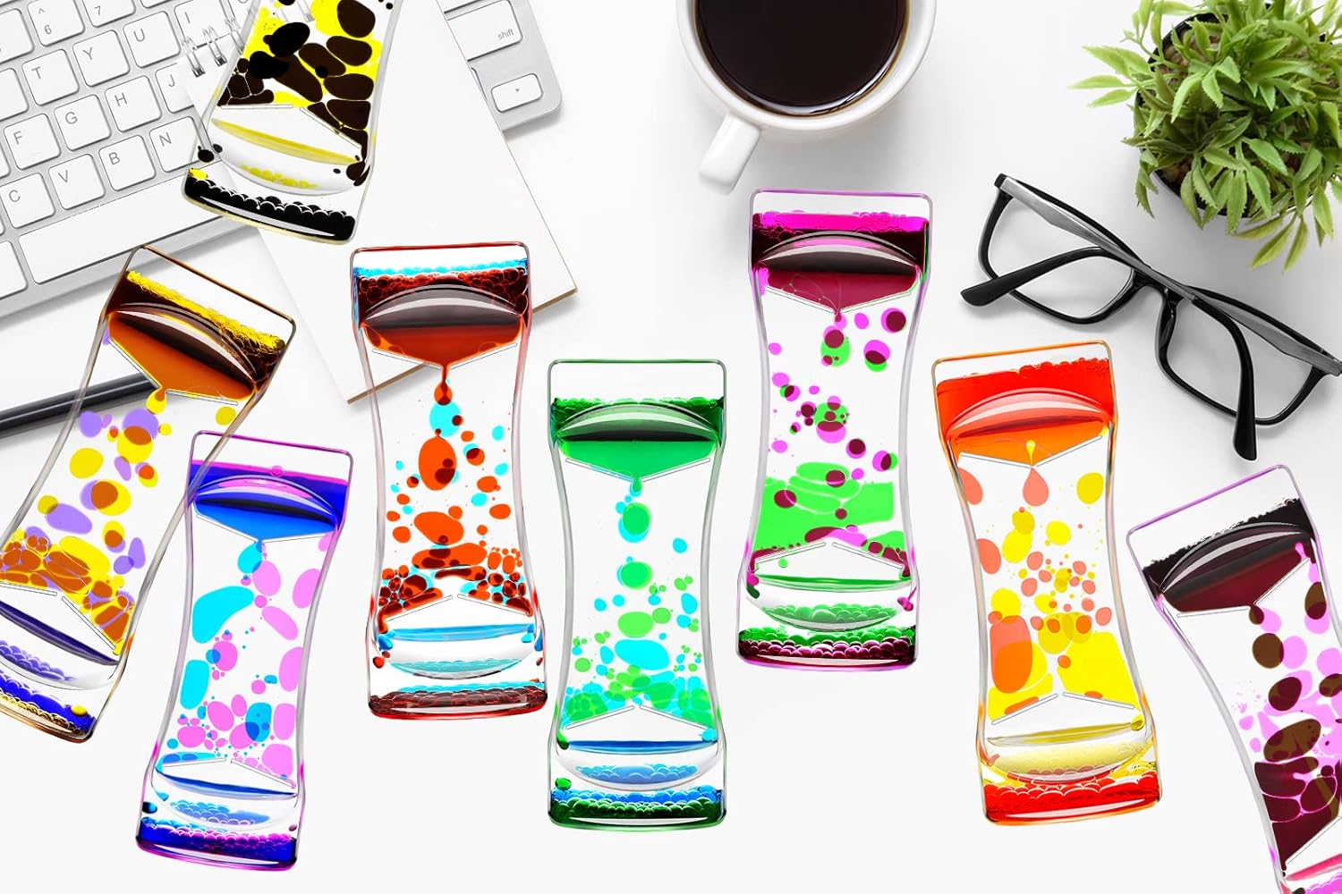 • 2.Liquid Bubbler Timer Toys: Great desk sensory play top toy for all ages ranging from children to adults. A great Home Ornament and office relax decor. The soothing rainbow colors remind you to slow down, relax and enjoy every moment. The liquid motion bubbler will help your calm down or focus on something.