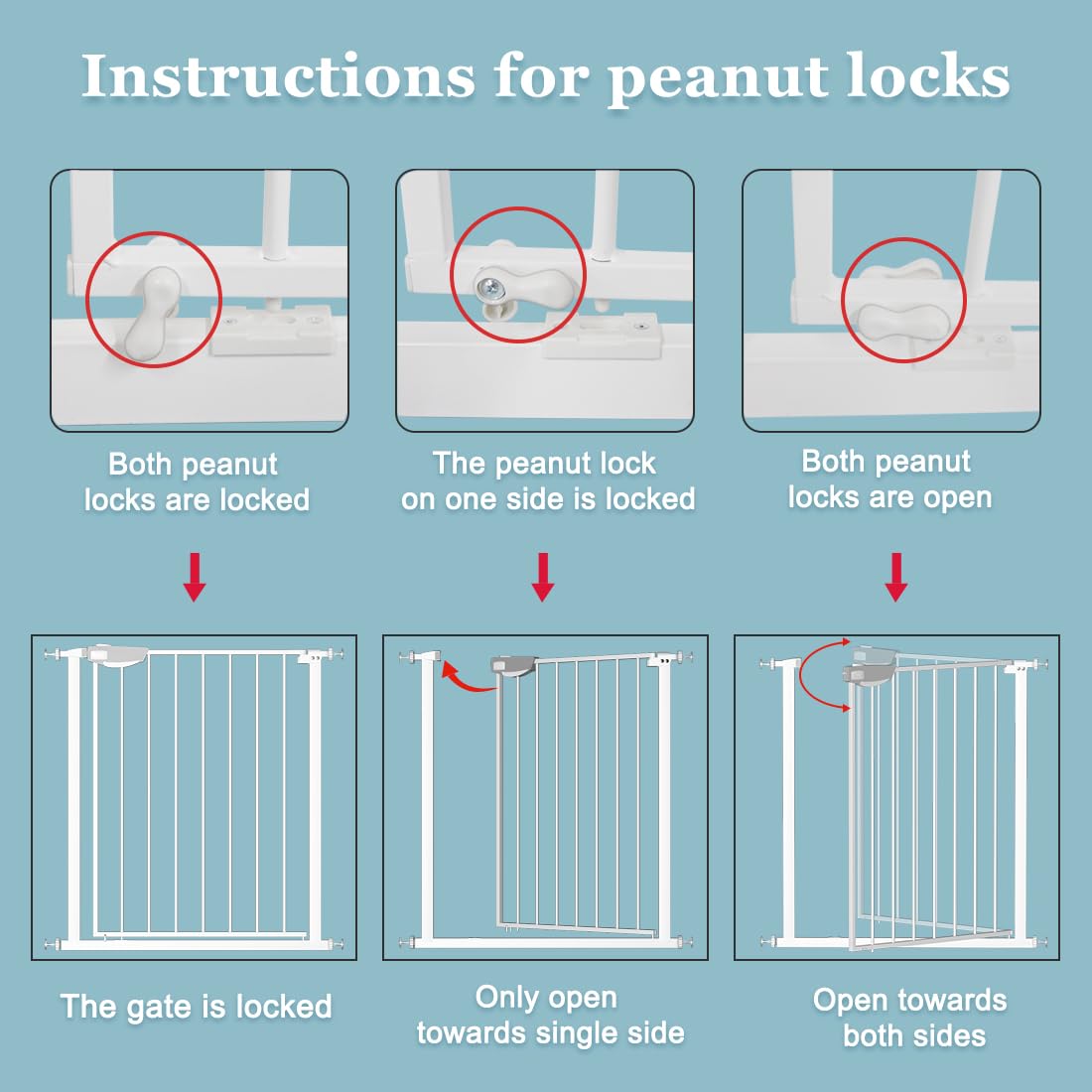 - 【Triple Lock System】Babies will be blocked by the safety baby gate since we designed a triple locking system that is easy for adults to open while tough for babies. At the top of the gate, there are two buttons and each of them controls one lock. To open the gate, you should press both buttons simultaneously. And at the bottom of the gate, there are two peanut locks to control the opening direction and locking. With these triple locks, curious babies will be well protected by our metal gate.