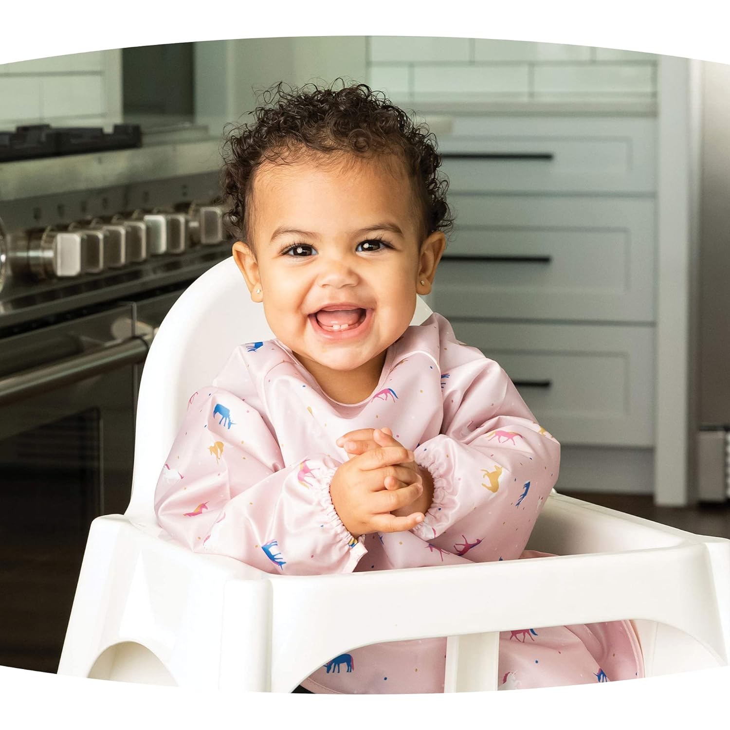 - TRAVEL BUDDY:The must-have baby feeding essentials for on-the-go parents! Our long sleeve waterproof smock bib (fits 6-24 months) is a versatile wipeable bibs with scratch-free closures and 360 degrees puree-proof protection.This bib with sleeves is perfect for plane or car meals, It folds flat in diaper bags,handles baby-led weaning messes and makes a great gender-neutral baby shower gift.Ideal for parents needing baby eating essentials on the go.
