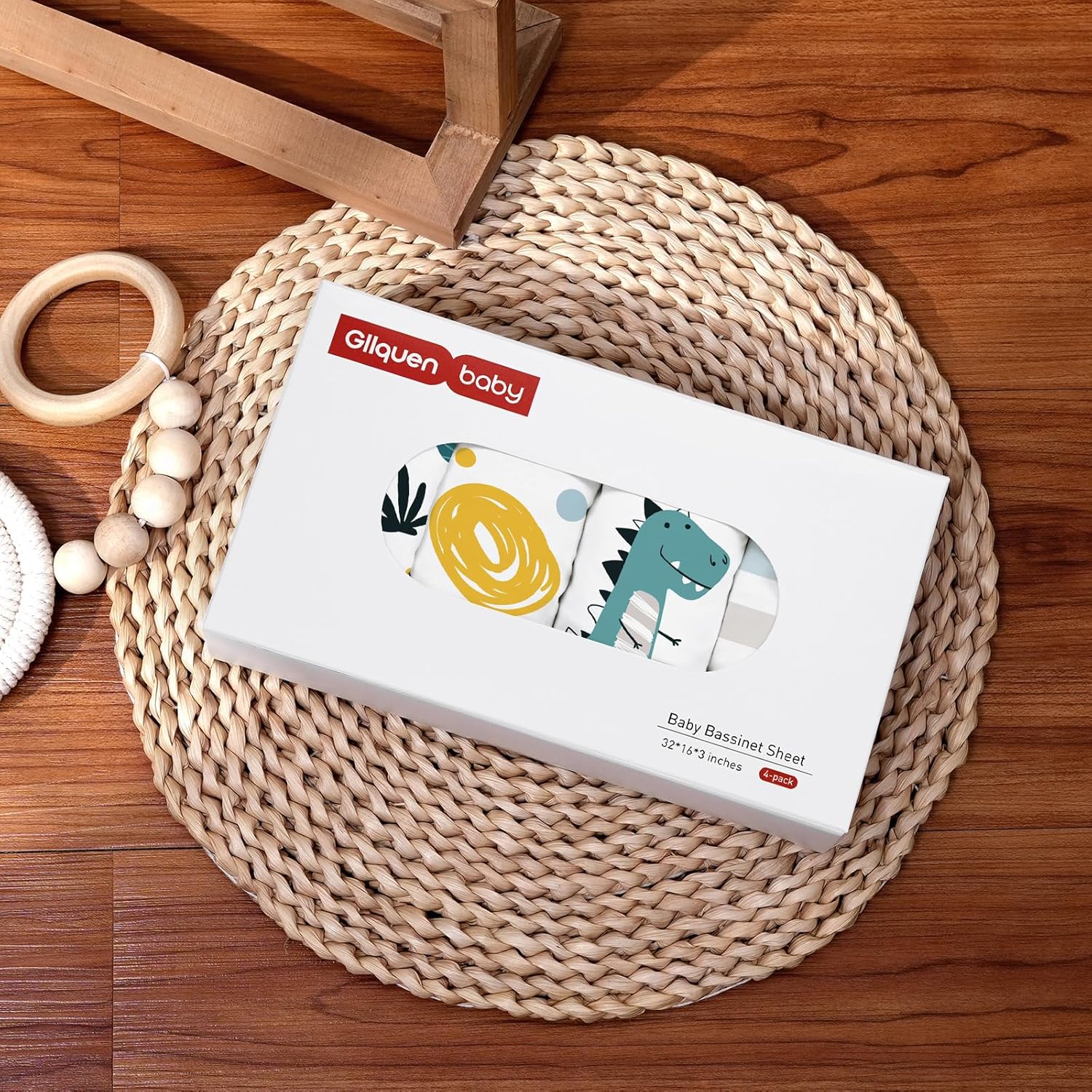 Gllquen Baby Bassinet Sheets 4 Pack, Breathable Cozy Fitted Mattress Sheet, Elastic Travel Crib Fashionable Floral Pattern, Standard Cradle Safe Sheets for Baby Boys Girls 32"x16"(Dinosaur)