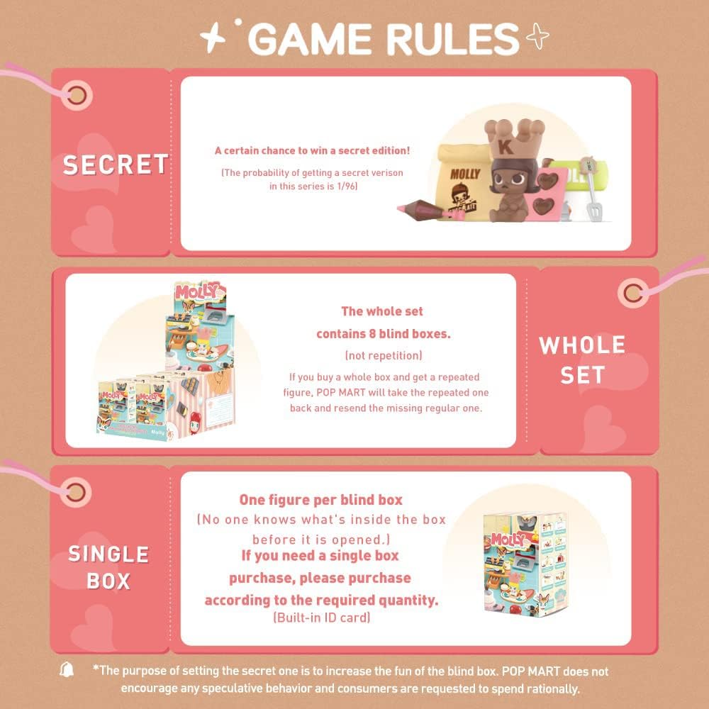 • POP MART MOLLY Cooking Series Prop Figures: Box toys are collectibles that come in a sealed box, with the content unknown to buyers until they open it. This collection contains 8 regular figures, and 1 hidden edition (Love Chocolate).