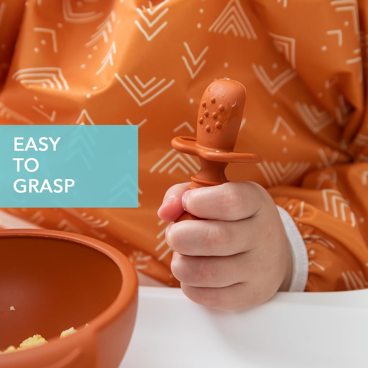 Bumkins Baby Utensils Set, Chewtensils Silicone Spoons for Dipping, Self-Feeding, Baby Led Weaning, Trainer Learning, First Stage Eating, Soft Practice Fork and Spoon, Babies 6 Months, Clay
