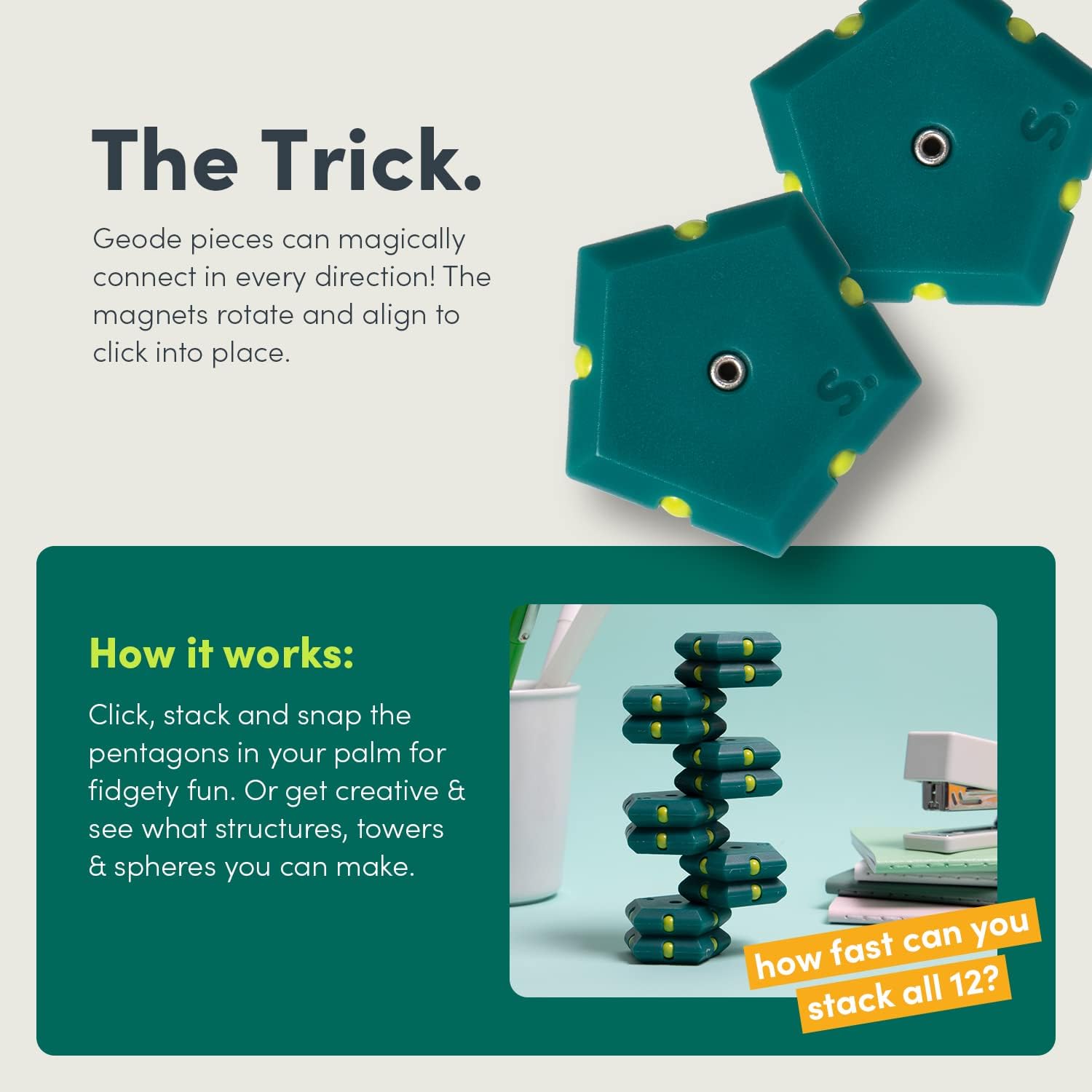 • FUN FRUSTRATION FREE FIDGET: Fidget to find your favorite configuration! Geode pieces connect on every side so you’ll always find a connection. Easy to use, harder to master - you’ll be playing with these pentagons permanently! Way more fidgeting fun than a fidget spinner, trust us!