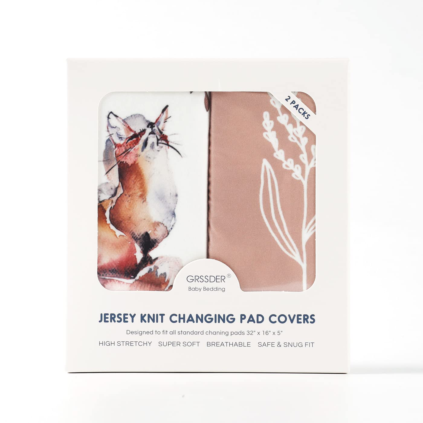 GRSSDER Stretch Ultra Soft Jersey Knit Changing Pad Cover Set 2 Pack, Change Table Pad Covers Fit 32"/34" x 16" Pads Safe and Snug, Cute Diaper Change Table Sheets for Girls, Fox Pattern for Baby