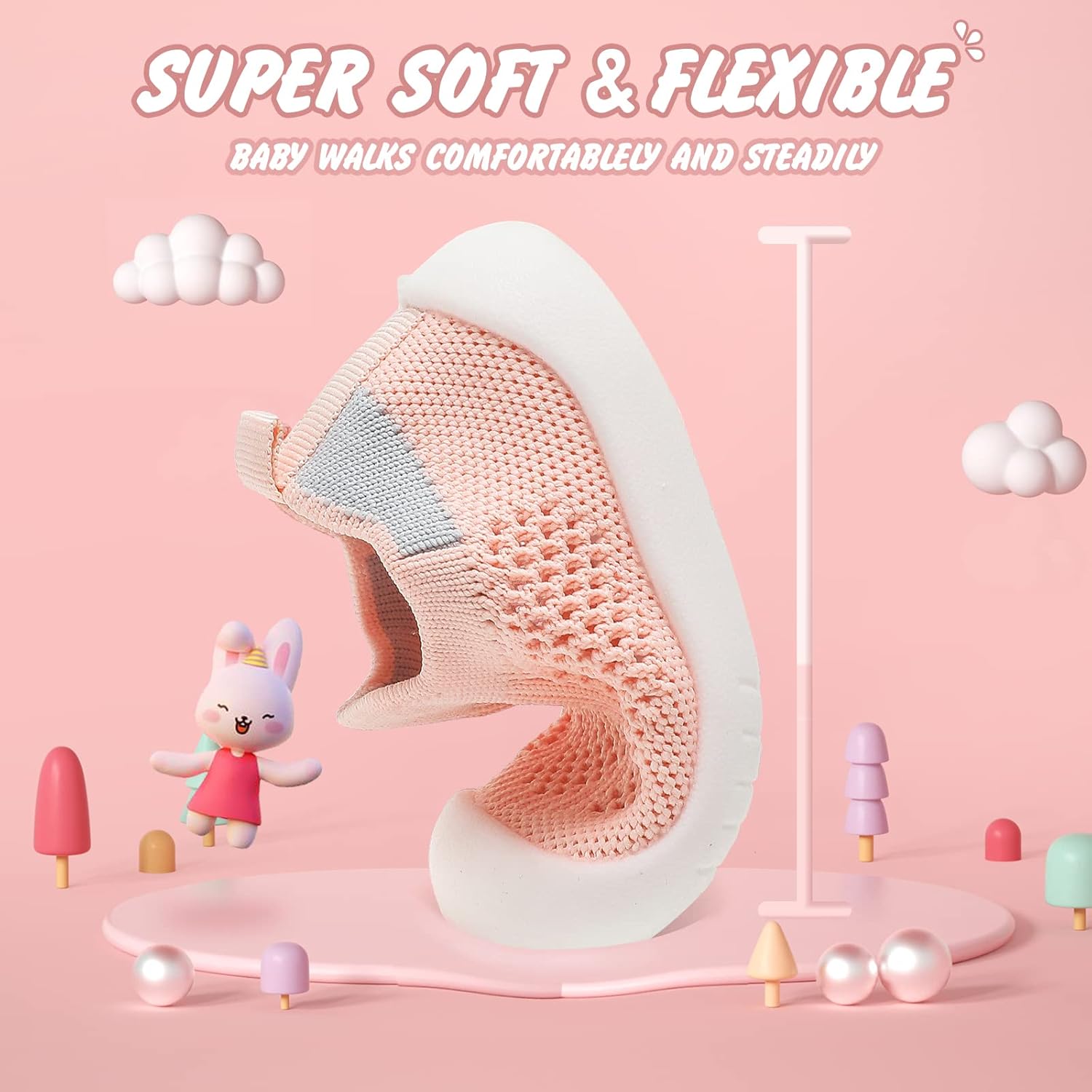 - Soft & Comfortable :The upper features a soft new upgraded one-piece knit fabric,which can make the baby feel soft even without socks.The sole adopts a 1/3 scientific bending design, which just fits the bending of a 1-4 year old baby's foot when walking, making it easier to exert force and help easy learning to walk. A pair of comfortable shoes brings kids a pleasant walking and running experience.