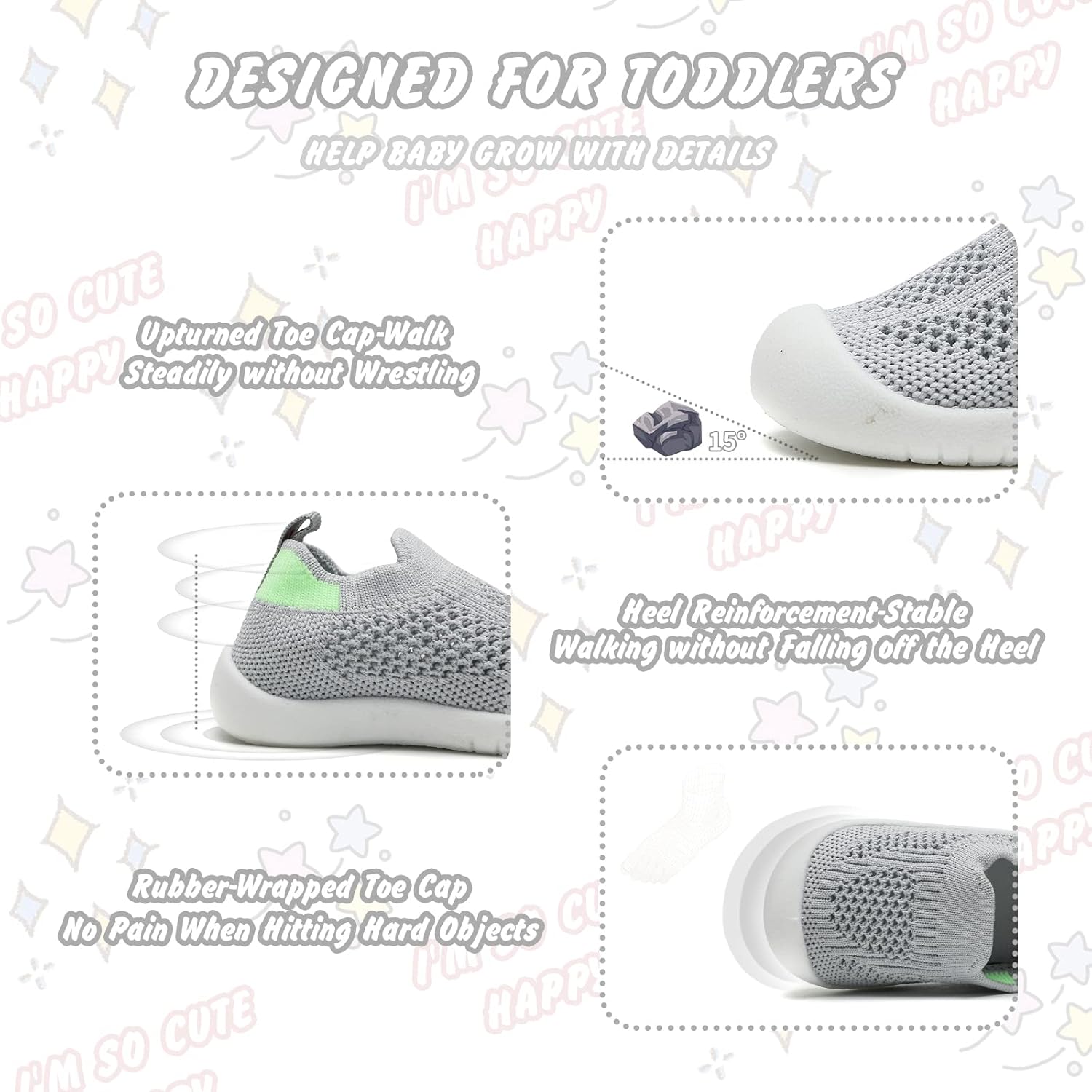 - Soft & Comfortable :The upper features a soft new upgraded one-piece knit fabric,which can make the baby feel soft even without socks.The sole adopts a 1/3 scientific bending design, which just fits the bending of a 1-4 year old baby's foot when walking, making it easier to exert force and help easy learning to walk. A pair of comfortable shoes brings kids a pleasant walking and running experience.