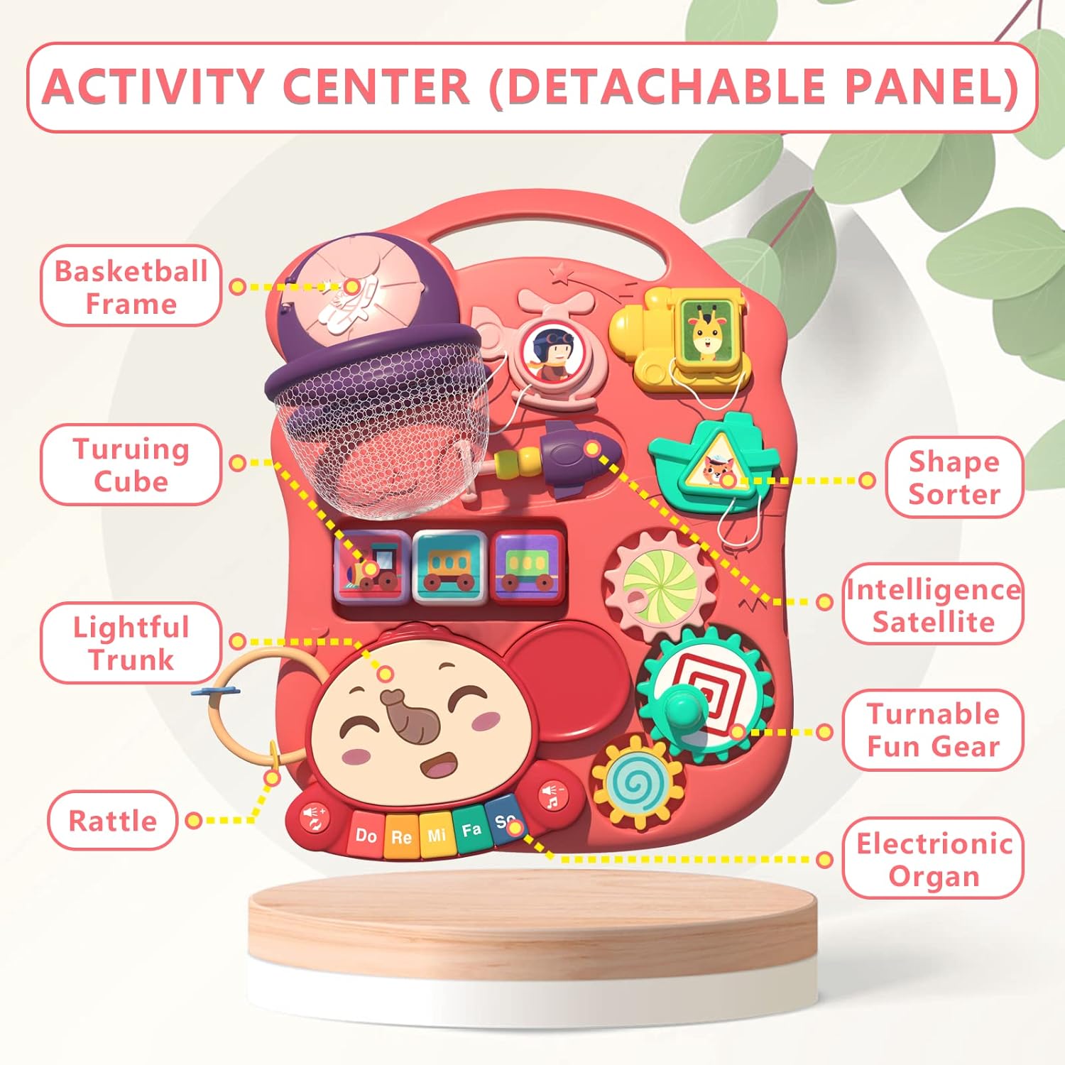 • Engaging Play Panel: Detachable table includes a basketball hoop (3 balls), shape sorter, spinning rollers, and a removable piano keyboard to spark creativity and teach colors, shapes, and rhythm.