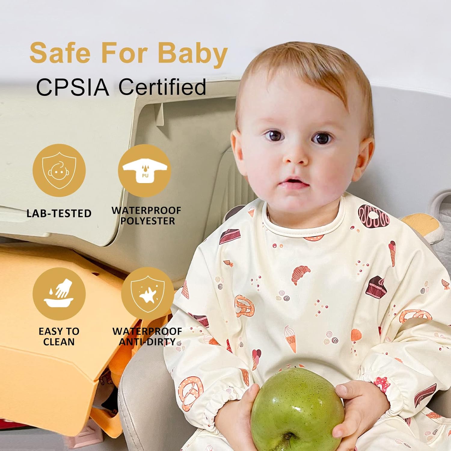 - Keeping Baby Clean & Saving Cleaning Up Time : The baby bib with sleeves for eating is full coverage & long sleeve design. Our baby eating bib not only keeps baby clean but keeps the highchair clean as well! This toddler smock bib is waterproof, stain-resistant, oil-resistant. Don't get worried about the mess, it's just easy to get all the food and stains form it. Our waterproof baby bibs saves you so much clean up time. Making meals and hands on activities less of a hassle