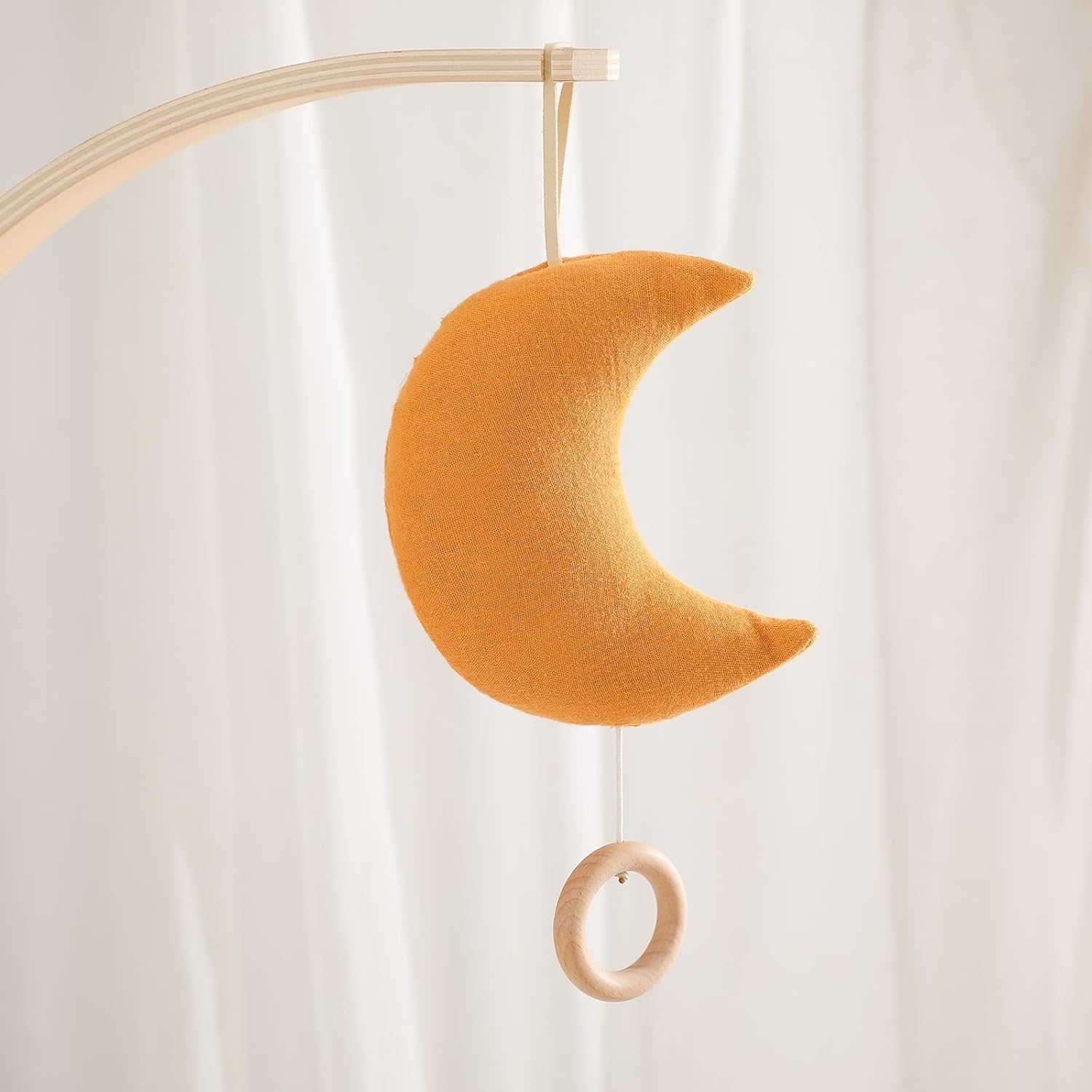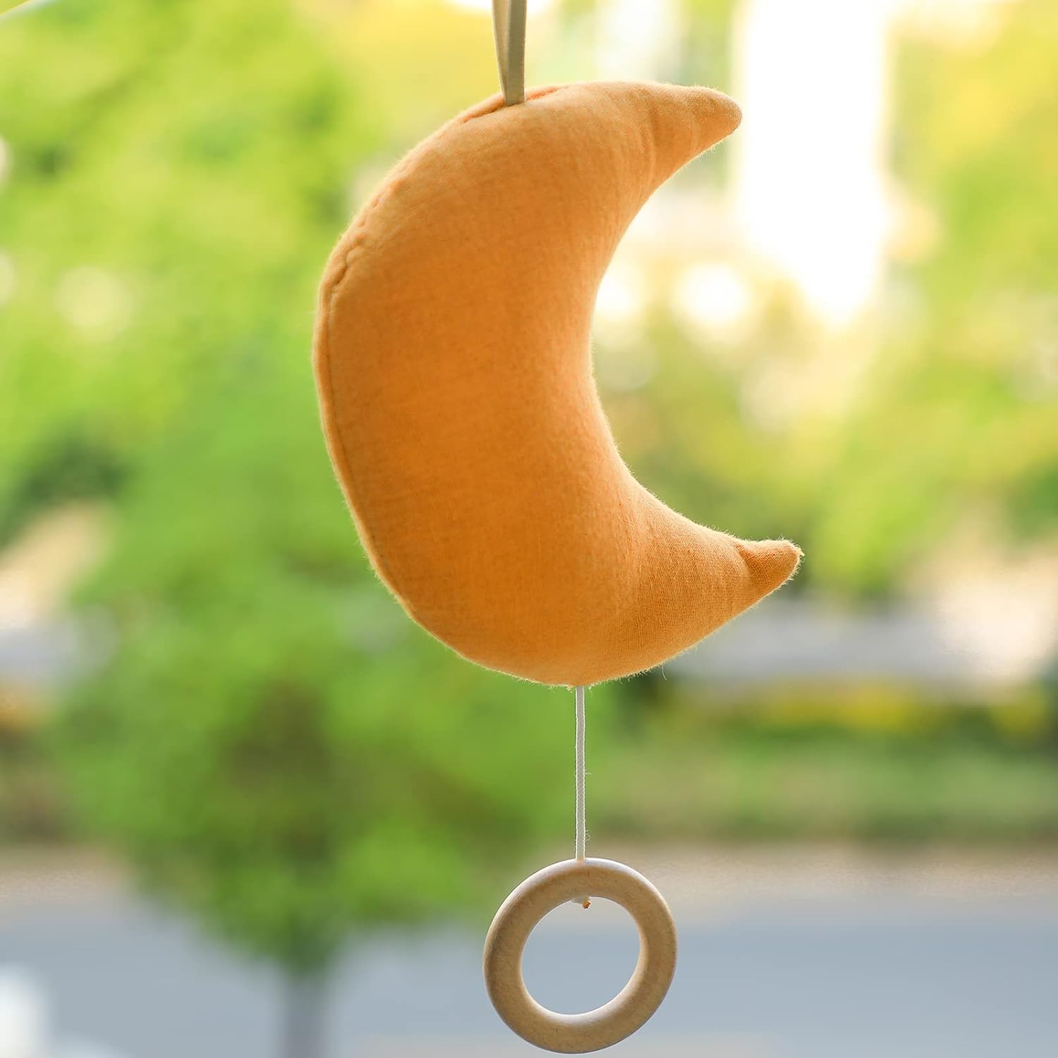 • 🌙 BABY TACTILE TOY QUALITIES - This moon-themed travel toy features an adorable shape, playful chime and soft fabric texture. Fabric loop allows for attachment to most carriers, strollers, play gyms, cribs and more. Size - L*W*H: 15cm*13cm*5cm (5.9"*5.1"*1.9"); Length of the hanging loop: 8.5 cm(3.3''); Length of the cord: 5cm-25cm (1.9''-9.8'')(contract and extend).