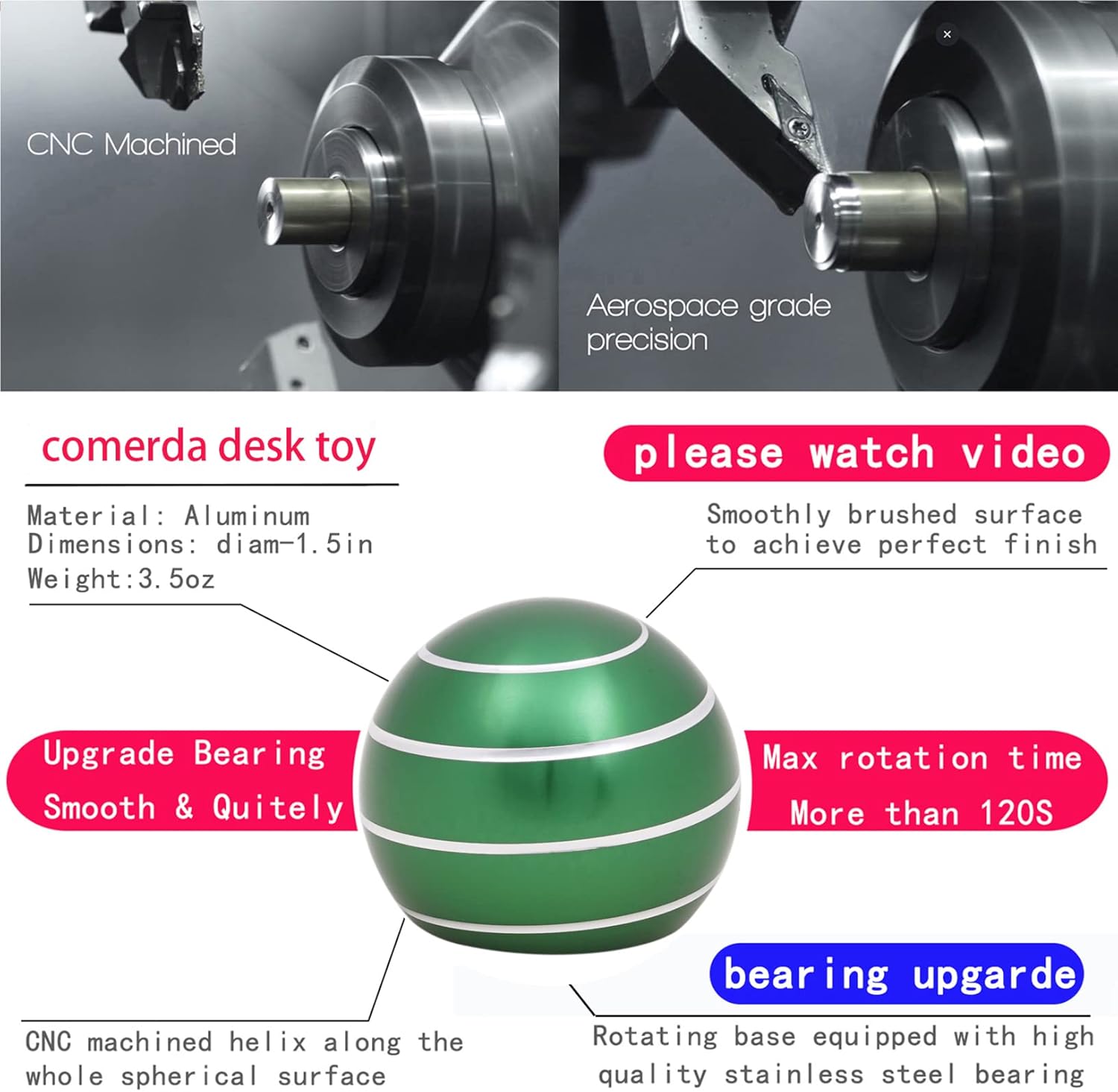 • 1.5in & 3.5oz. Precision CNC manufactured metal desk toy with threaded grooves on the surface.