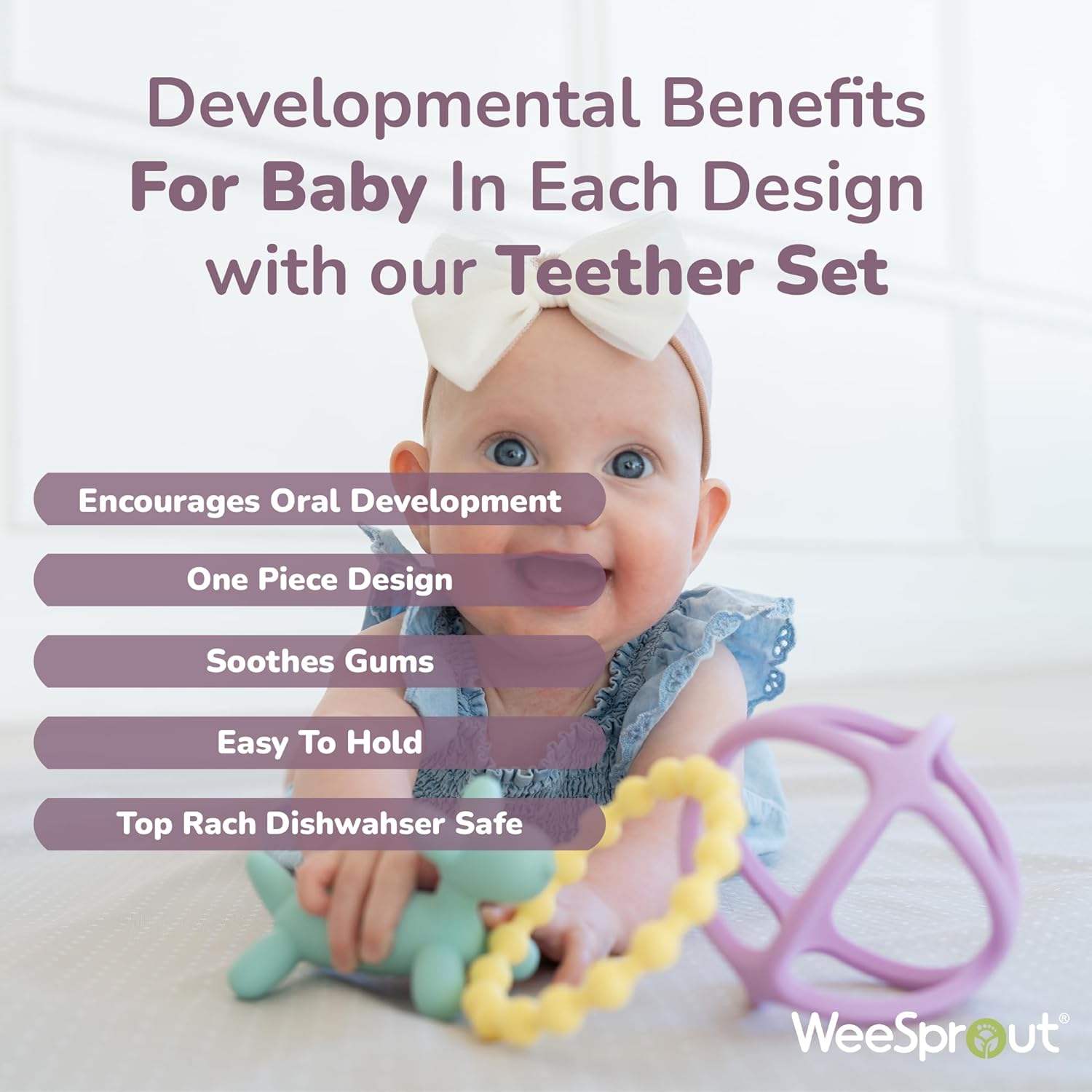• BPA-FREE, FOOD GRADE SILICONE – WeeSprout baby teething relief toys are made with a high-density, super flexible silicone that can stand up to biting and chewing. They are also top rack dishwasher safe making them easy to clean and sanitize.