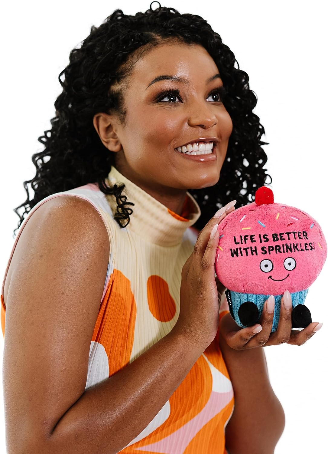 • FUNNY SUPERFOODS Can you hear the laughs already? Sprinkle kindness and positivity with our sweet tooth approved Punchkin. Topped with a cherry and decorated with a rainbow of colors, this delectable cupcake plushie is embroidered “LIFE IS BETTER WITH SPRINKLES”.