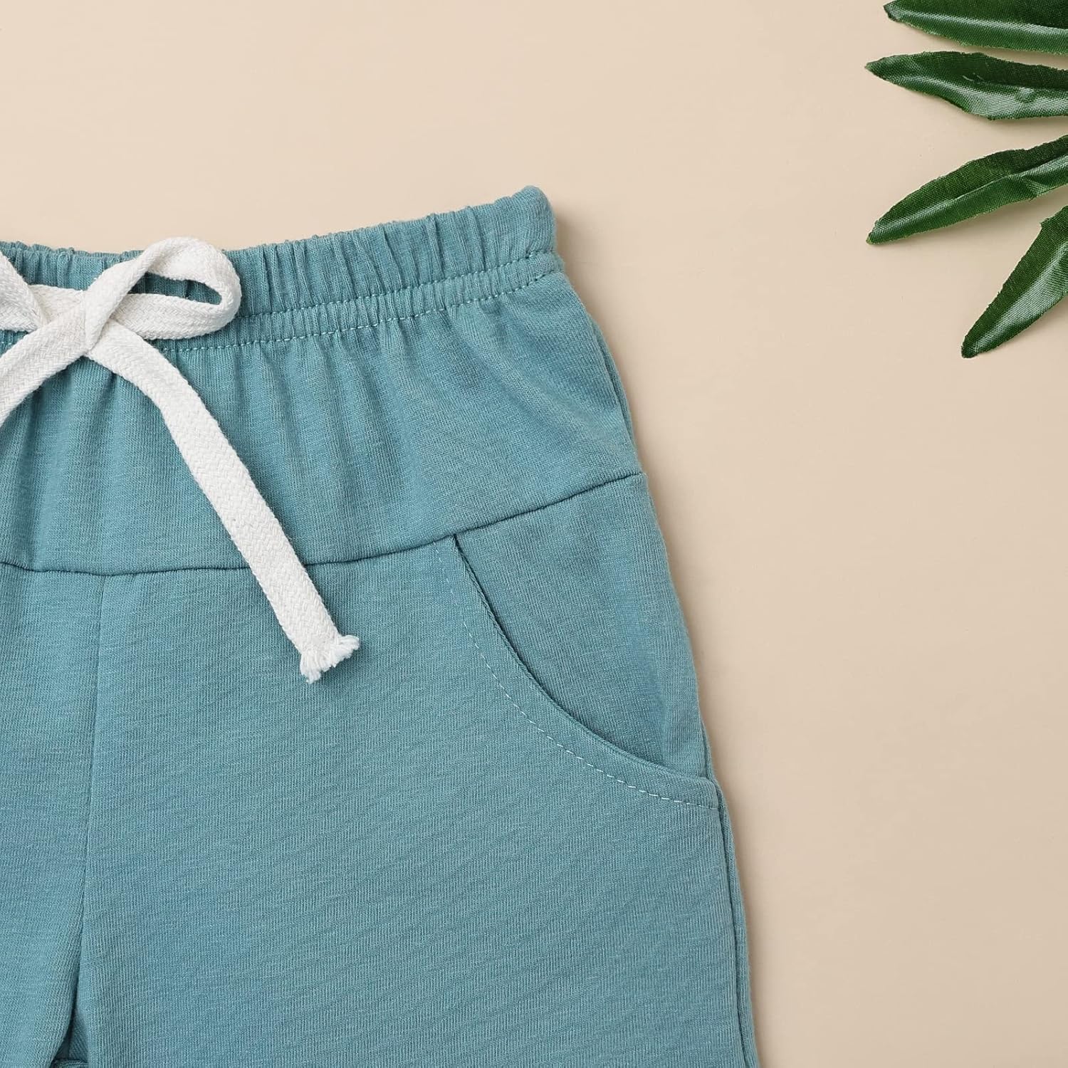 • ✯ Fashion Stitching and Contrasting Color Design: The top t-shirt has a cute little pocket in the front and comes in a variety of contrast colors, giving your sweet toddler baby boy a stylish look this summer. The solid shorts feature a high-quality elastic waistband and convenient side pockets, perfect for your little guys to put things such as snacks or toys while on the go.