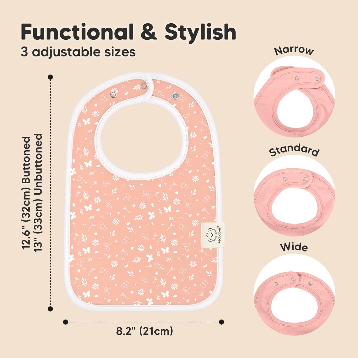 • 3 Adjustable Sizes With Soft Seams - With 2 sets of nickel-free snaps, you can adjust the girl and boy bibs according to your baby’s neckline. The soft-wrapped seams provide extra comfort for your baby while having the baby cloth bibs on.