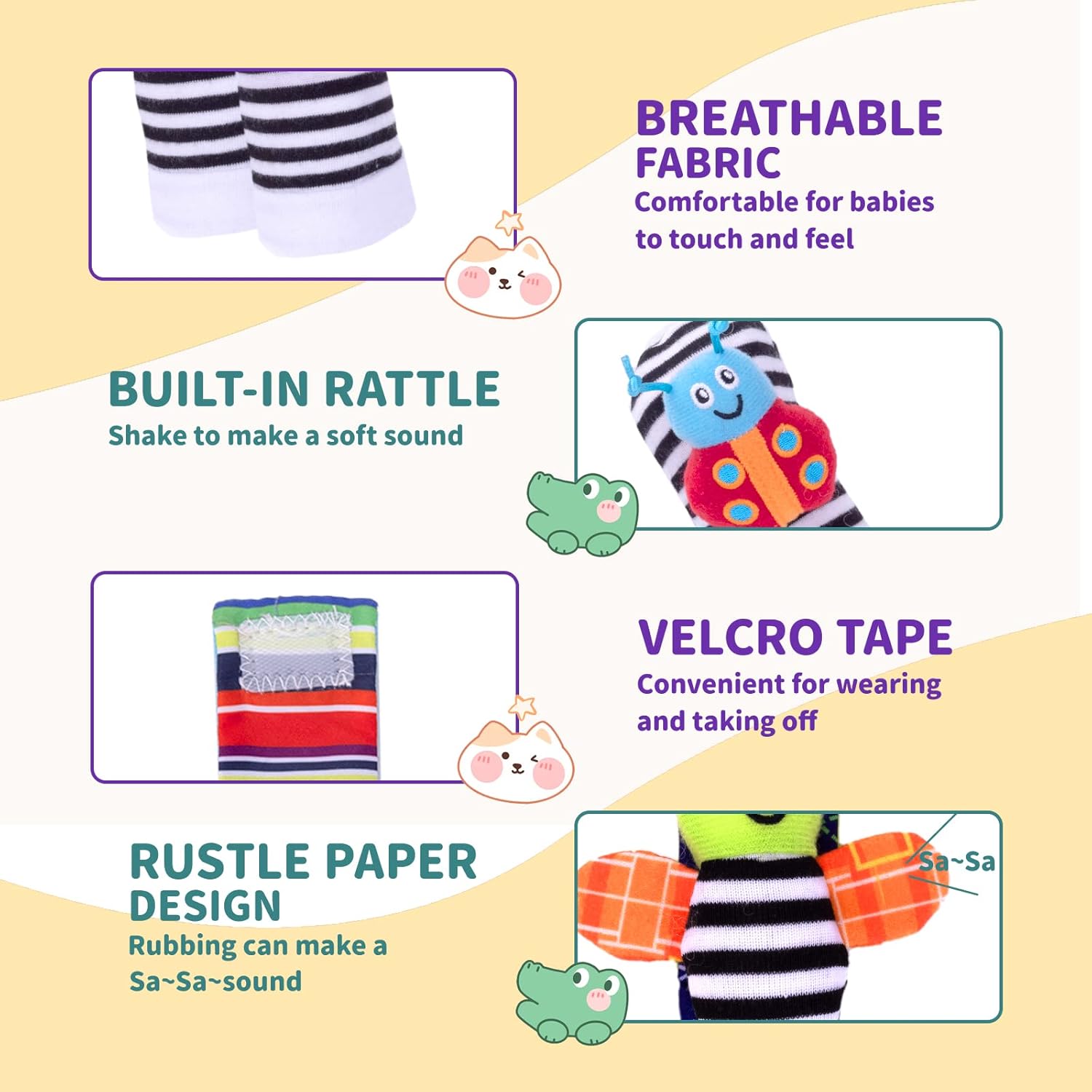- Cute Design- All Wrist Rattles and Foot Finder Socks have Bells Inside and The Wings of Bee and Butterfly were with Sound Paper, Socks and Wrist Toys Have Cute Animal Patterns with a Smile on Each Face, Bright Vivid Colors and Pleasant Rattle Noise, Visually Stimulate Baby's Vision and Hearing, Which Will Stimulate the Baby's Curiosity and Attract the Baby to Touch, Grasp, and Look At Them and Encourage the Baby to Explore, Help Babies Focus on Interesting Things.