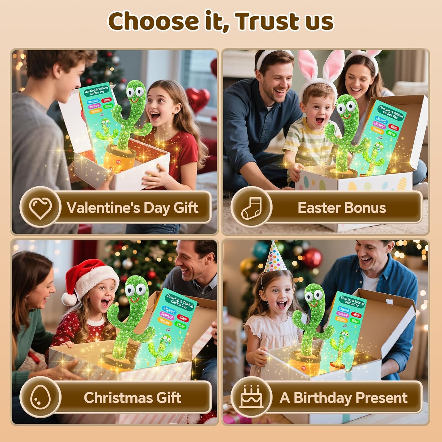• SINGING CACTUS TOY : Dancing singing cactus toy is crafted from non-toxic, safe, and soft plush fabric. This toy meets international safety standards for children's toys, including CPSIA, CPC, and ASTM certificates. Its base is made of plastic, ensuring stable standing on tables, and it's easily cleaned by wiping with a damp cloth.