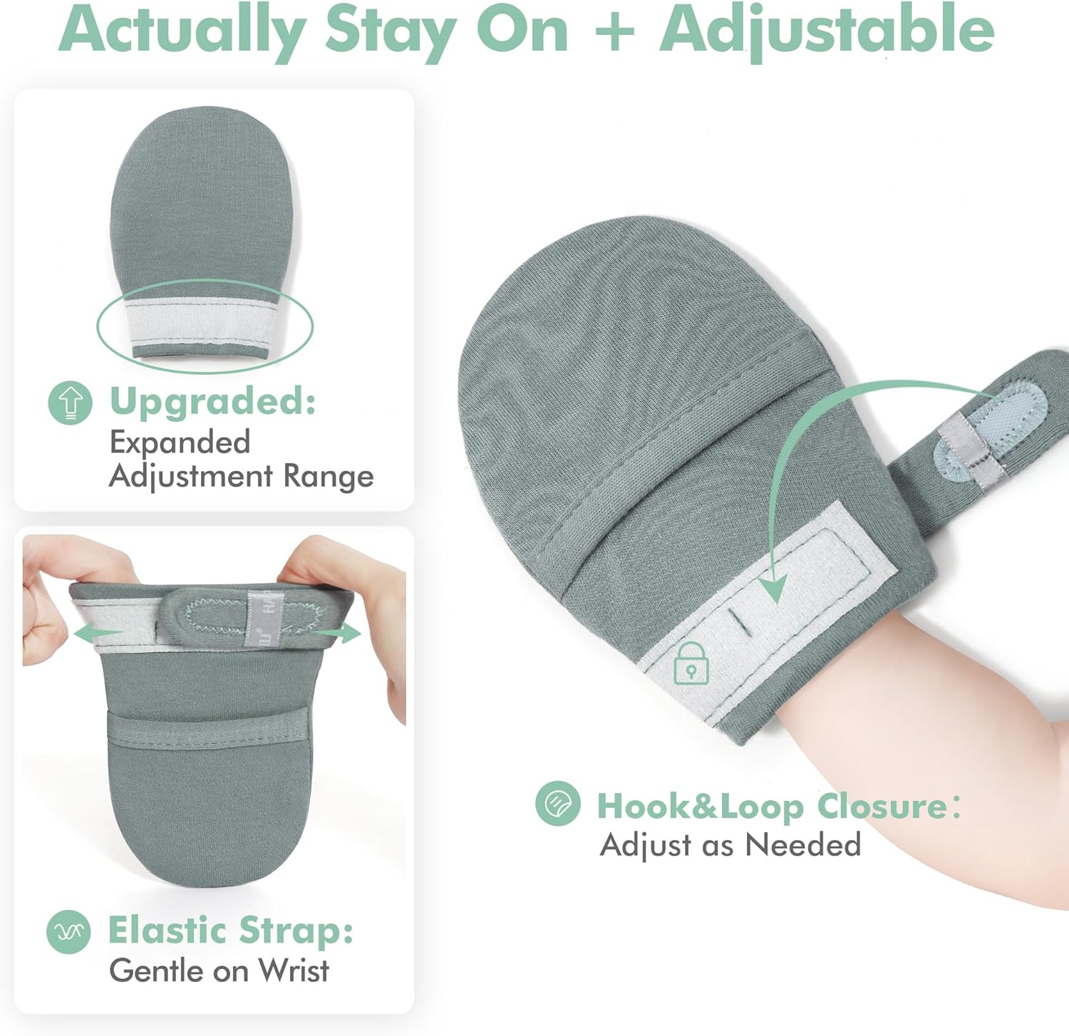 • [Designed to Stay on]: Every little one try his best to pull the mittens off. But with our Hook&Loop Closure and gentle ankle elastic, they would stay on to protect your baby as long as needed.