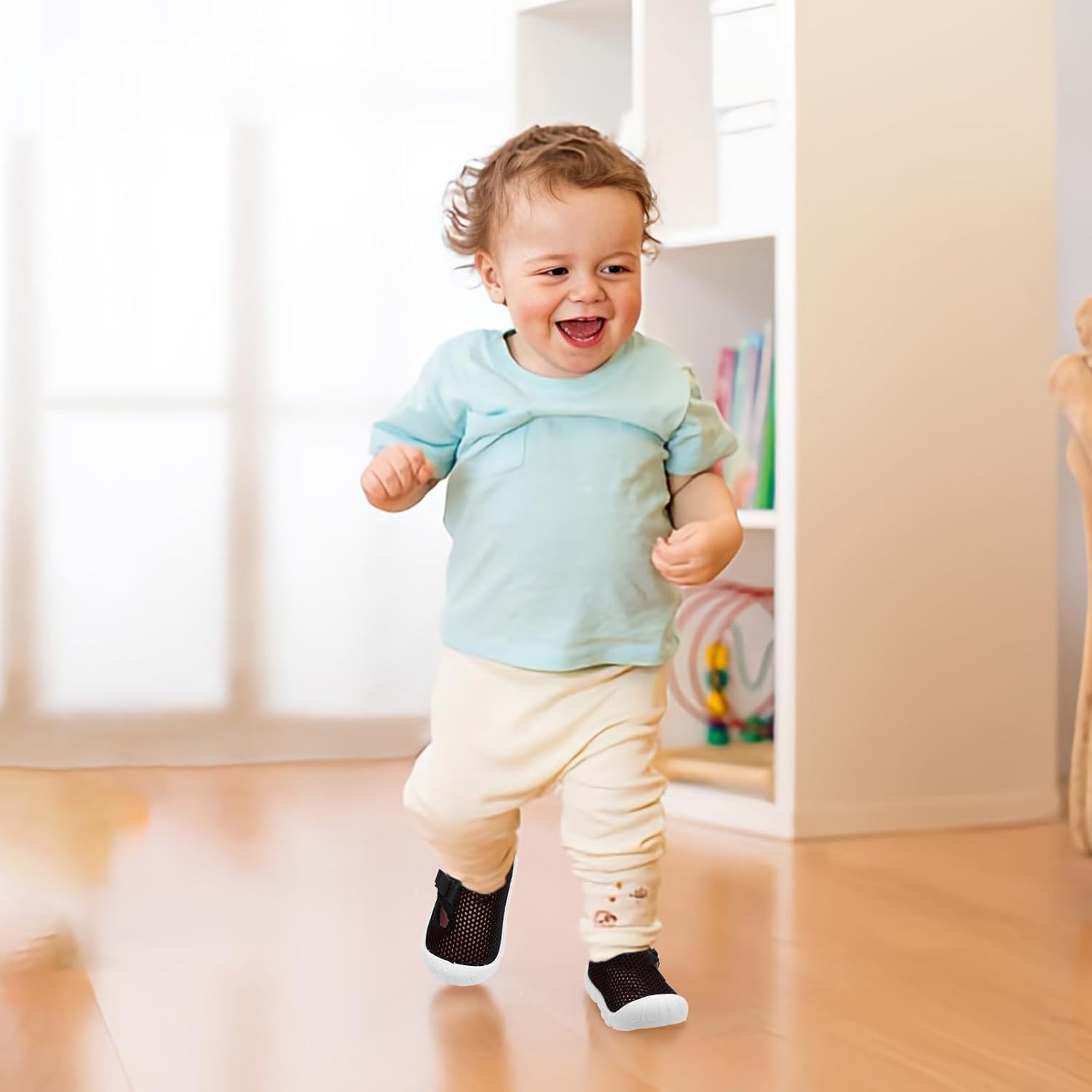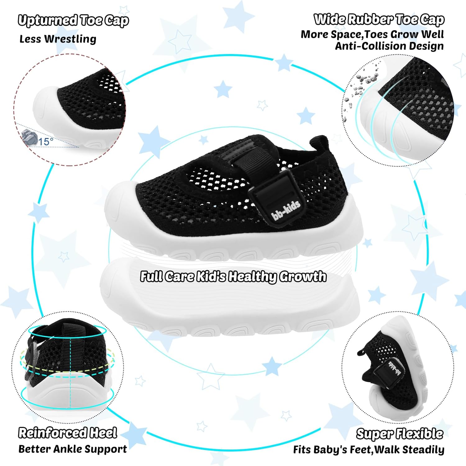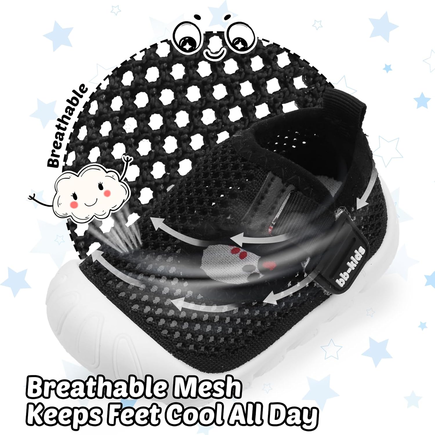 • Breathable Upper: The toddler walking shoes feature a breathable mesh upper that quickly absorbs sweat. Cut-outs enhance the breathability of the baby shoe, ensuring your baby stays fresh all day. Easy to clean and machine washable, making them convenient for busy parents.