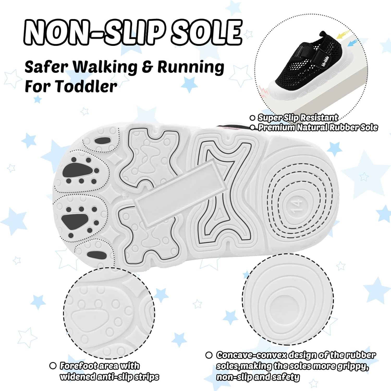 • Anti-skid&Shock Absorption: Toddler's Athletic Sneakers have a natural rubber outsole with high elasticity, effectively absorbing impact and distributing force evenly across the foot. The sole's unique cat's claw-inspired design enhances grip, preventing slips and aiding balance when toes touch the ground. Let your baby play happily and agilely, just like a cat.