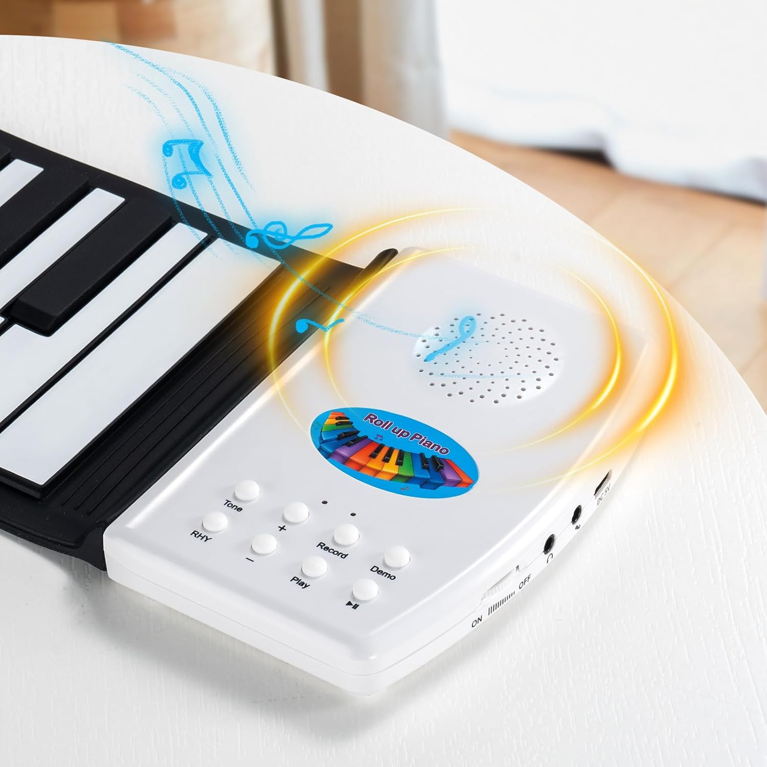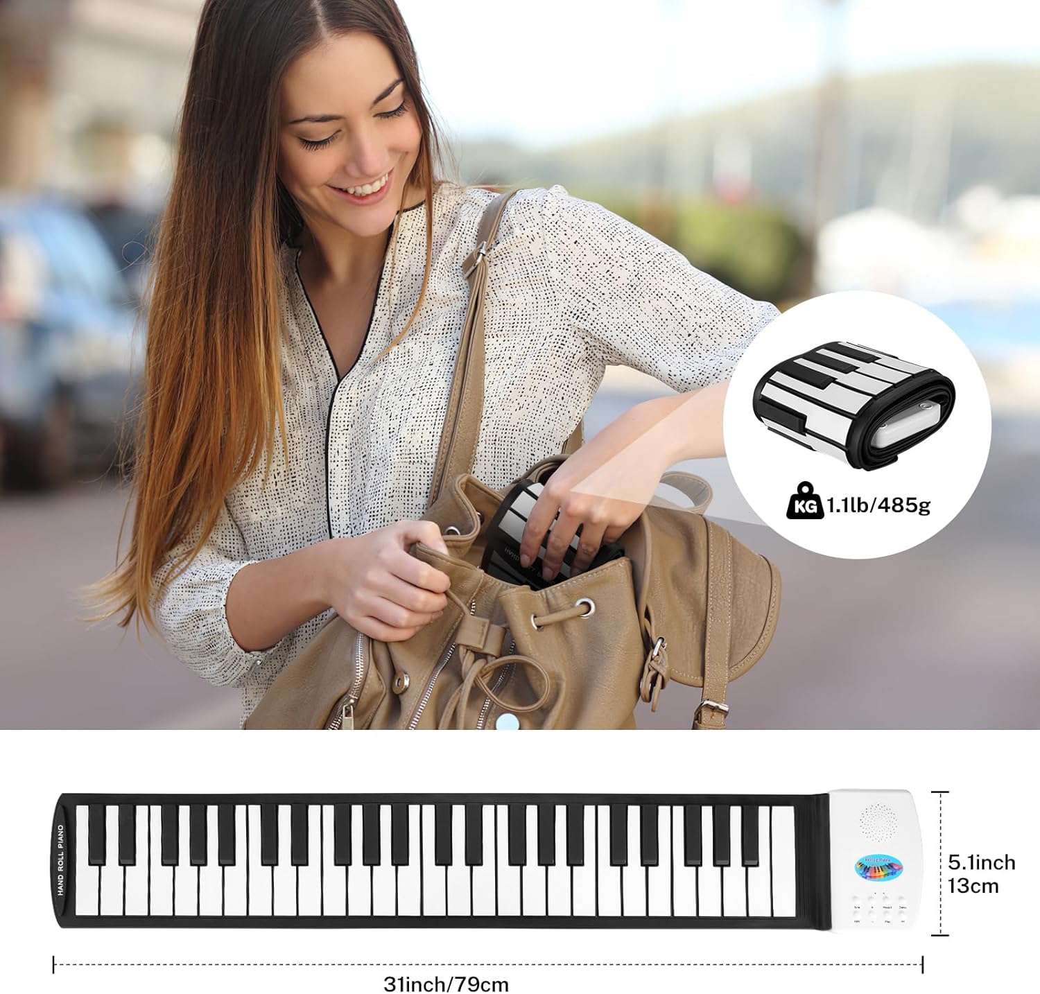 • ROLL UP DESIGN & PORTABLE & RECHARGEABLE --- The soft piano mat is portable and flexible. Easily unfold when playing, roll it back into the box or backpack after playing, it saves space and is easy to store. Easy to carry, you can take it anywhere and start playing with friends/family. Built-in rechargeable battery, you can charge it anytime.