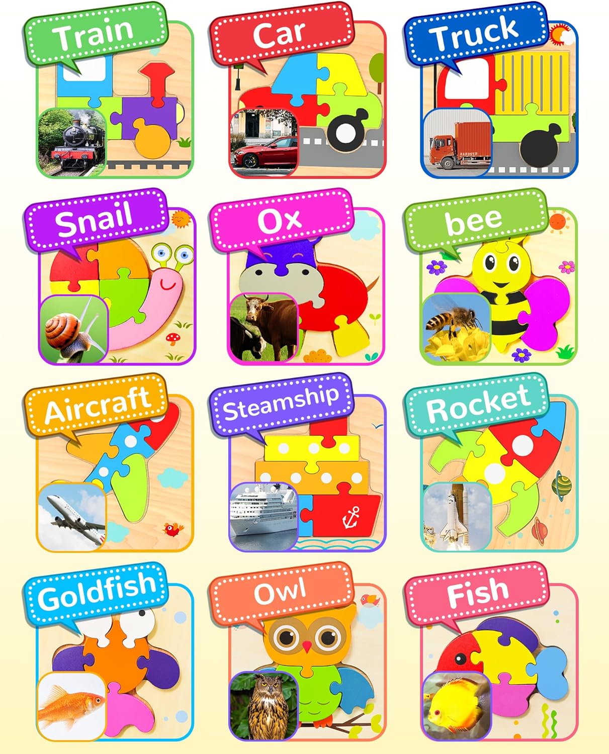 • LEARNING THROUGH PLAY: The montessori toys contain 2 pack animals and 6 pack well-selected vehicle jigsaw in the air, land, and sea, it includes a snail, hippo, car, truck, aircraft, rocket, steamship and train. It feed the developing minds of young kids, helping them practice fine motor skills, hand-eye coordination, and problem-solving. This puzzle also provides good opportunity for furthering verbal skills with colors, design, and vehicle names and inspiring imaginative adventures.