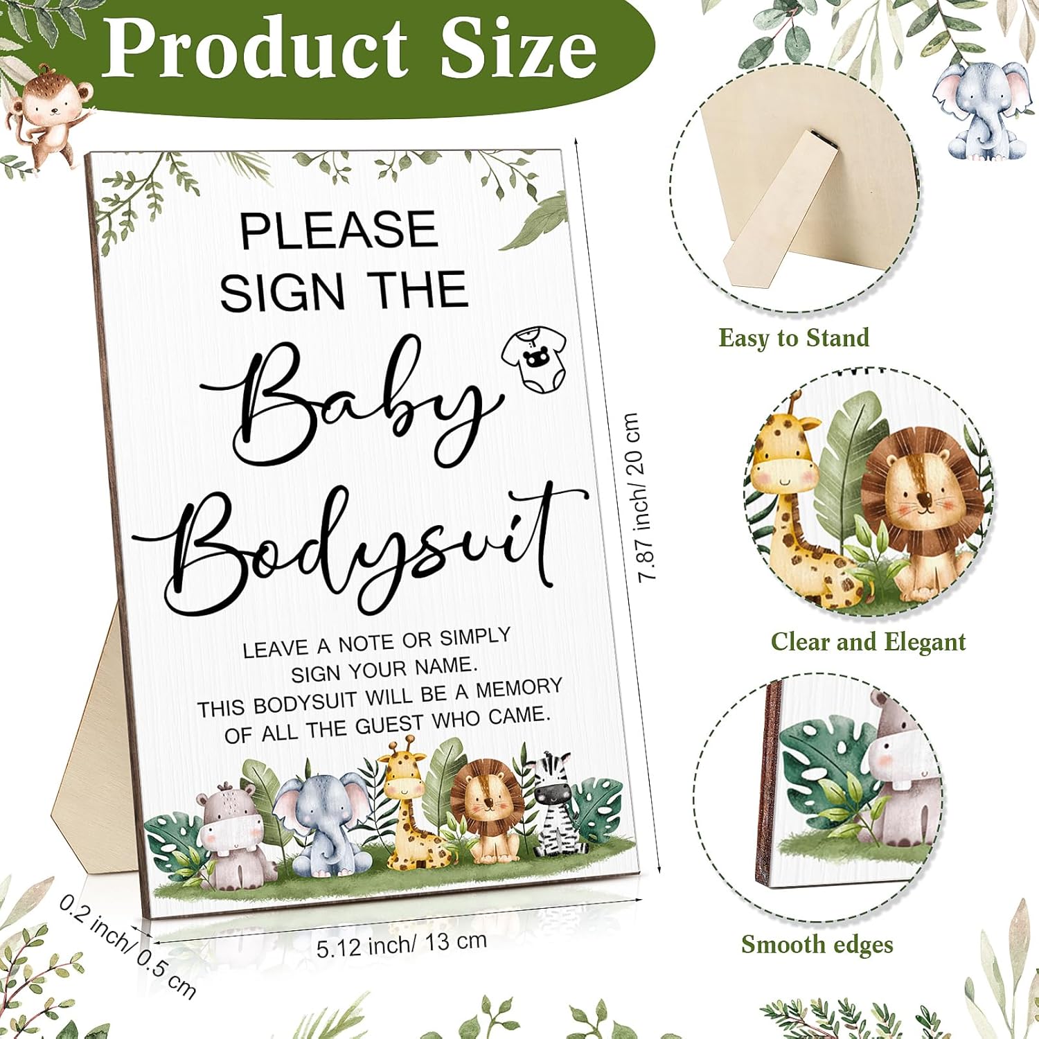 • Size Detail: the wooden baby shower game decor is approx. 5.12 x 7.87 x 0.2 inches/ 13 x 20 x 0.5 cm, there is a wooden holder on the back to make it stand stably and firmly; The baby bodysuits are suitable for 24 months baby, the blank area is enough for you to DIY