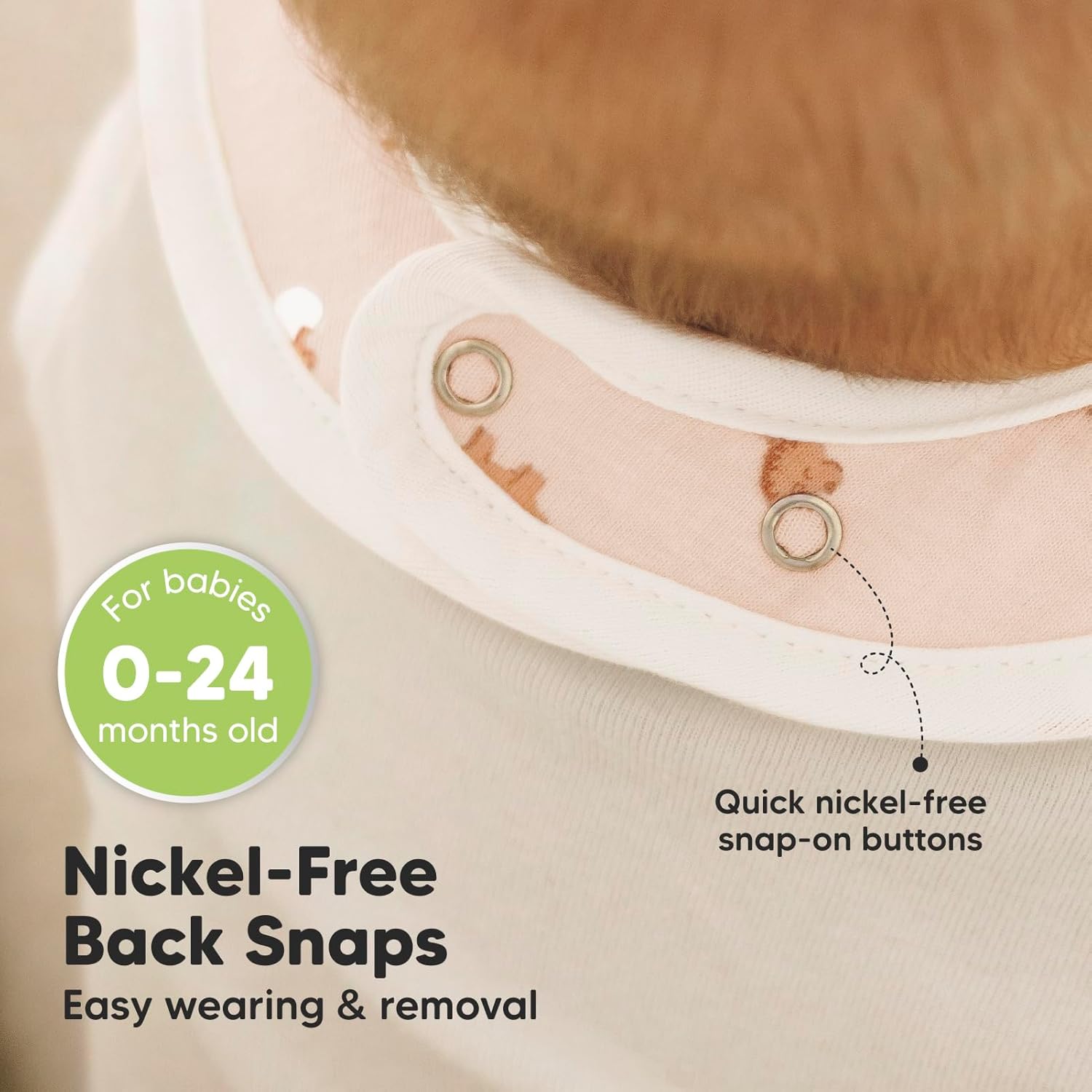 • 3 Adjustable Sizes With Soft Seams - With 2 sets of nickel-free snaps, you can adjust the girl and boy bibs according to your baby’s neckline. The soft-wrapped seams provide extra comfort for your baby while having the baby cloth bibs on.