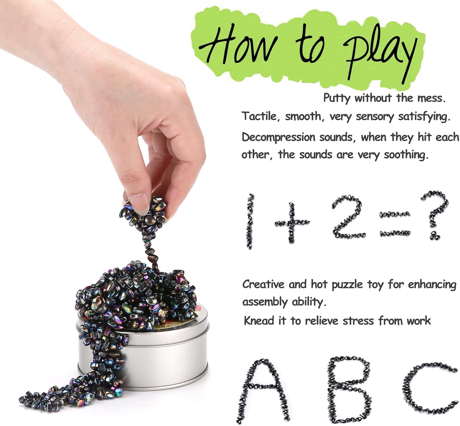 • Desk Toys Features: Smooth and irregular small particles, like puddy, are attracted to each other. The size of each is about 0.7cm, and it is hand-polished. It is almost impossible to find 2 pieces that are exactly the same. The quantity in a box is about 550 PCS putty, which is enough to play.